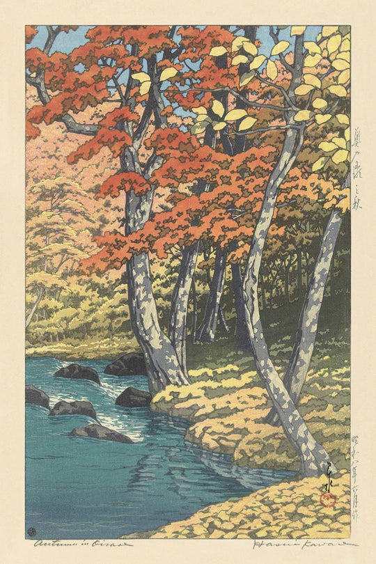 "Autumn in Oirase" by Hasui Kawase, created in 1933, captures the ethereal beauty of Japan's serene landscapes during autumn. Kawase, a prominent figure in the Shin-hanga movement, is renowned for his mastery in portraying natural scenes with stunning detail and atmosphere, bringing the tranquility and vivid colors of Oirase Gorge to life.