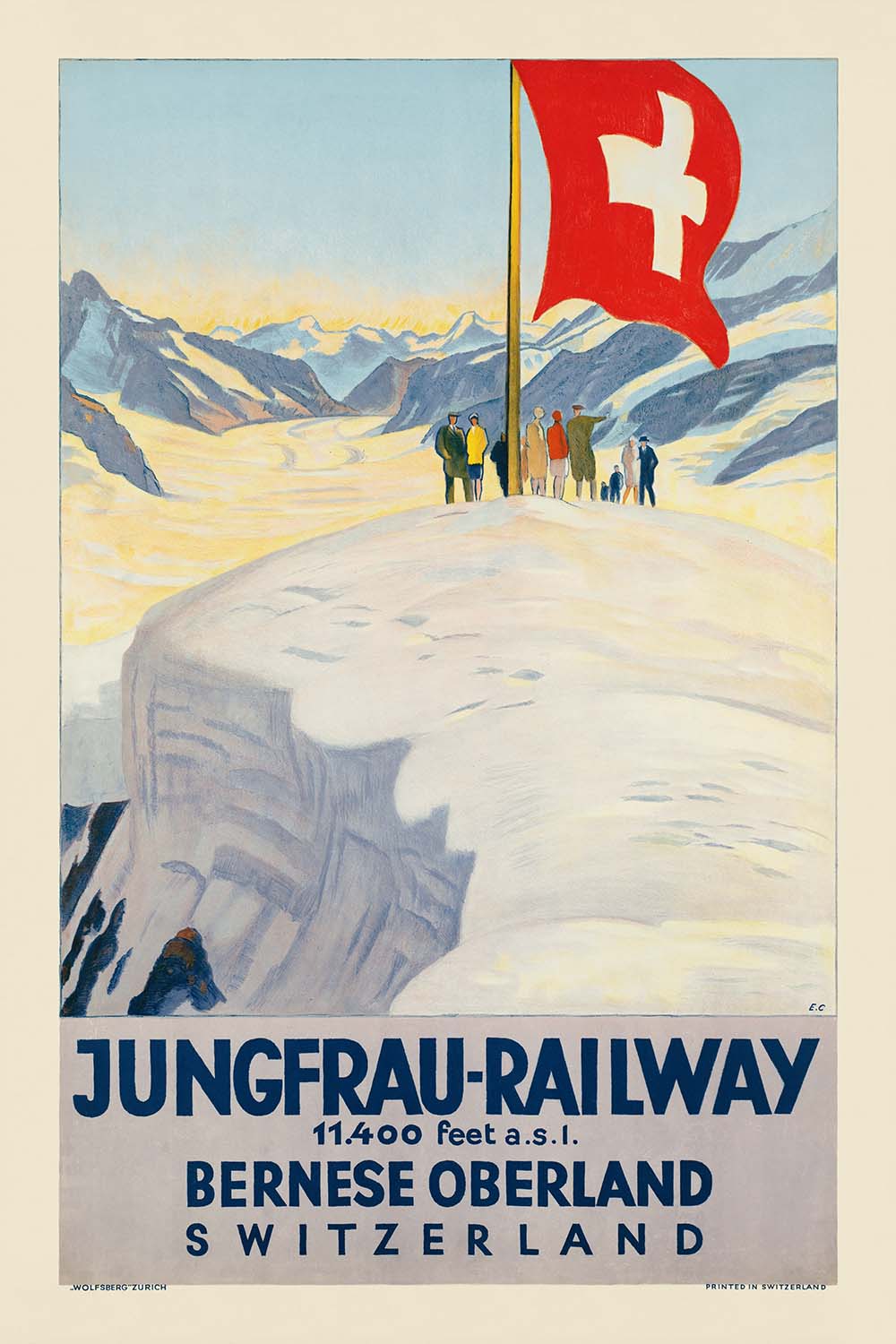 This composition celebrates the Jungfrau Railway’s ascent to the high Alpine world, a marvel that made the Jungfraujoch and its sweeping icefields accessible to ordinary travelers. The poster’s printed legend—“Jungfrau-Railway. 11.400 feet a.s.i. Bernese Oberland, Switzerland”—conveys both the altitude and allure of this destination, where crisp air, continental glaciers, and panoramas over the Aletsch region became central to Swiss national identity and to the golden age of Alpine tourism.