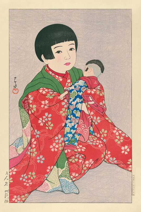 Hasui Kawase, born in Tokyo in 1883, gained acclaim for his enchanting landscapes and atmospheric depictions of Japan. He was a master of capturing the serenity of rural and urban Japanese life, and his works continue to capture audiences worldwide. This particular artwork, "Child with Doll," stands apart for its focus on an intimate, domestic scene, showcasing his versatility beyond landscape artistry.