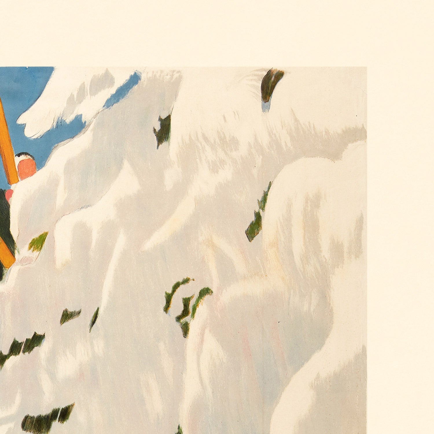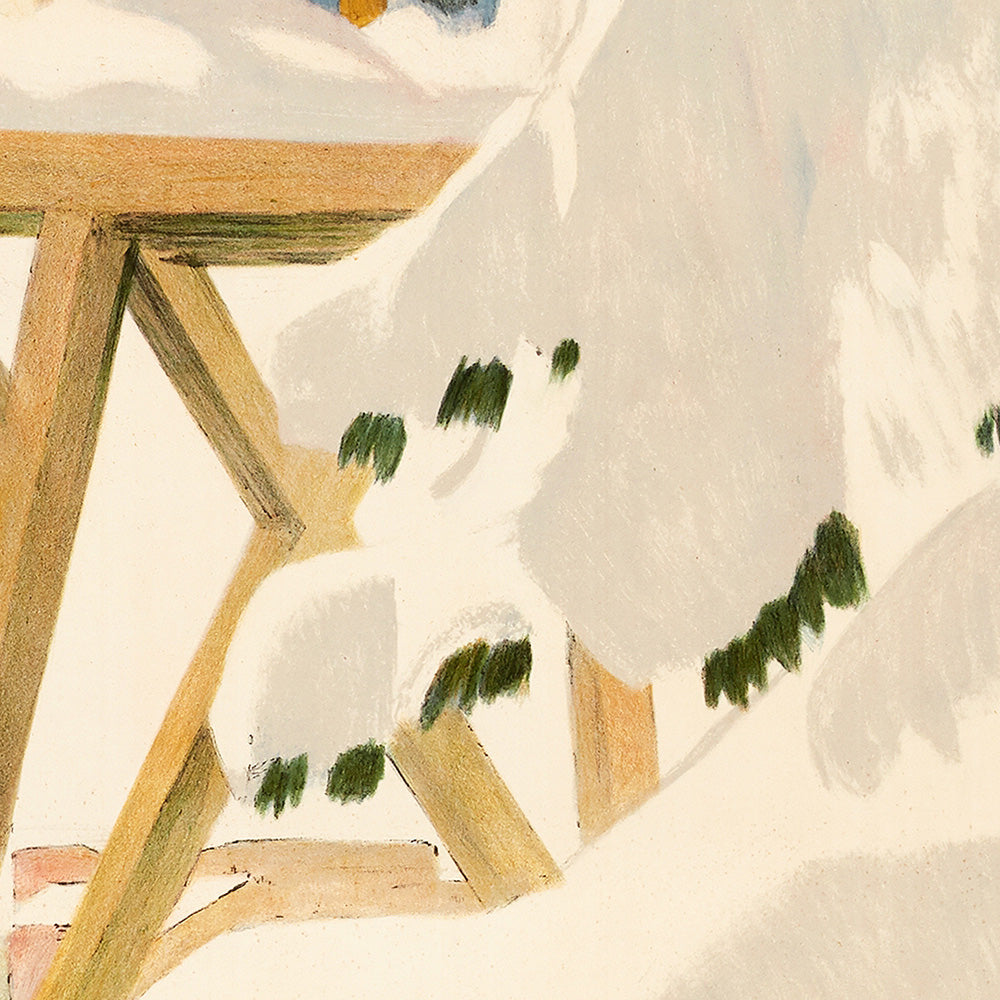 Davos itself is central to the history of alpine leisure: a high-altitude town in the canton of Graubünden, it became famous for its dry, sunlit climate and later for winter sports. By 1918, posters like Cardinaux’s were instrumental in communicating the allure of travel—suggesting restorative sun, snow, and the pleasures of the mountains without a single excessive detail. His Davos design turns the landscape into a modern emblem: the mountains are streamlined into assertive planes, and the place name becomes a beacon of invitation.