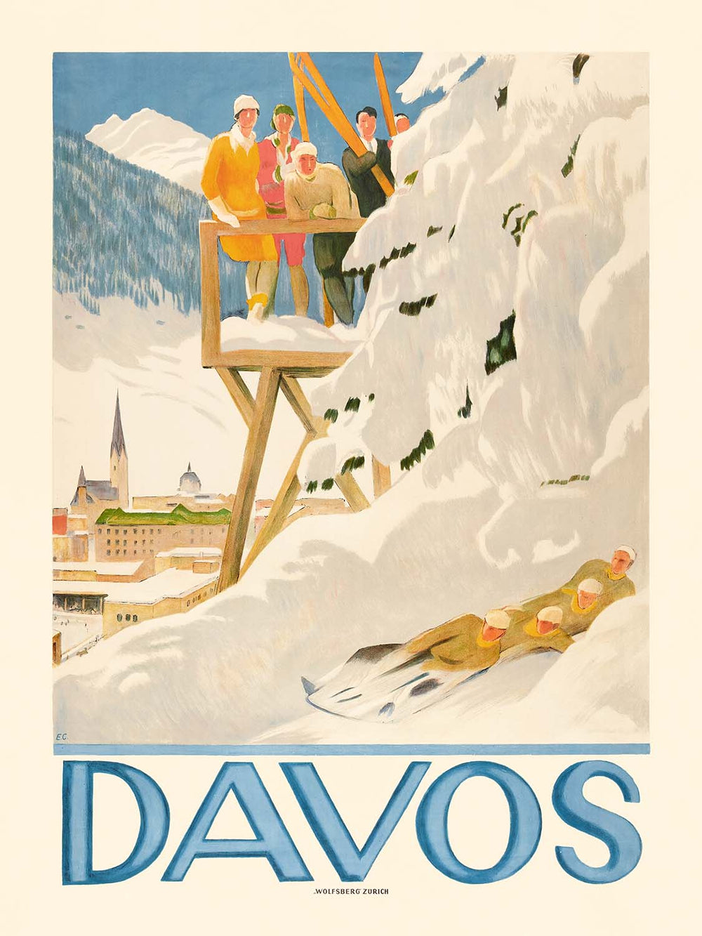 Davos by Emil Cardinaux (1918) captures the crystalline serenity of the Swiss Alps at the dawn of modern winter tourism. Cardinaux distills the high-mountain drama into crisp, geometric forms: snowfields in clean, luminous whites, a pale alpine-blue sky, and the town’s name, DAVOS, declared in bold, sunlit lettering that floats across the upper register. This iconic composition evokes the pure air and bright light that made the Graubünden resort a byword for health, sport, and elegant escape.