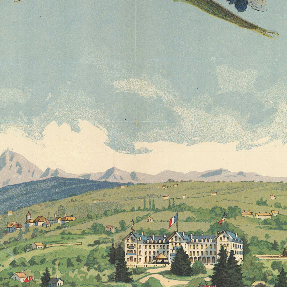 The subject here is Évian‑les‑Bains at the height of spa culture, when Europe’s rail and lake‑steamer networks ushered visitors to thermal resorts for rest, cure, and alpine air. The poster foregrounds the Source Cachat—the spring that launched Évian’s reputation—while the lake bustles with a paddle steamer flying the tricolor and small pleasure craft gliding across Lac Léman. For anyone who has strolled Évian’s quays or ferried to Lausanne, the scene is instantly evocative.