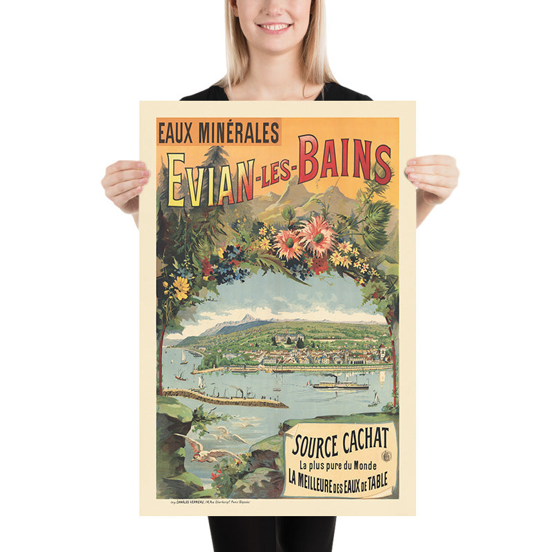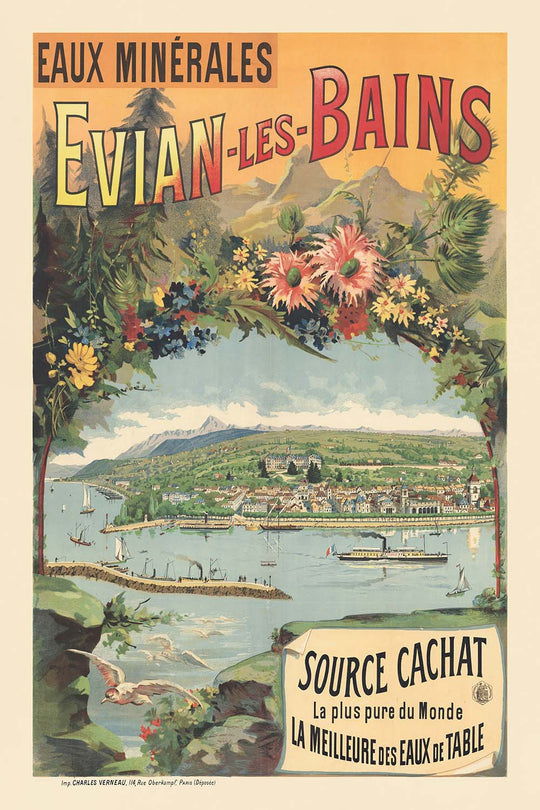 Eaux minérales. Evian-les-Bains by Imp. Charles Verneau is a luminous Belle Époque travel poster first published in 1890, celebrating the spa town of Évian-les-Bains on the French shore of Lake Geneva. The design frames a sweeping panorama of the lakeside resort—steamers, sailboats, and a tidy promenade—beneath the Alps, all crowned by bold headline lettering. A garland of alpine flowers forms a natural cartouche around the view, while at the lower right a curled placard reads “Source Cachat – La plus pure du Monde – La meilleure des eaux de table,” anchoring the poster in the famed mineral spring that made Évian a destination.