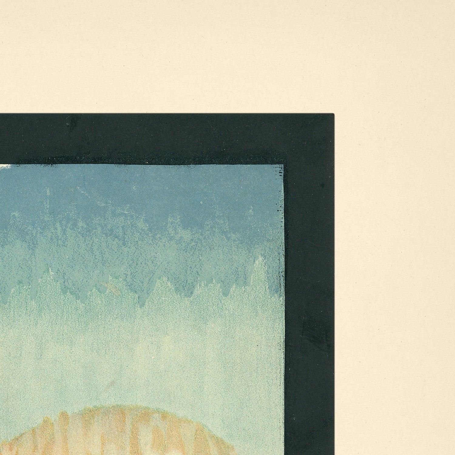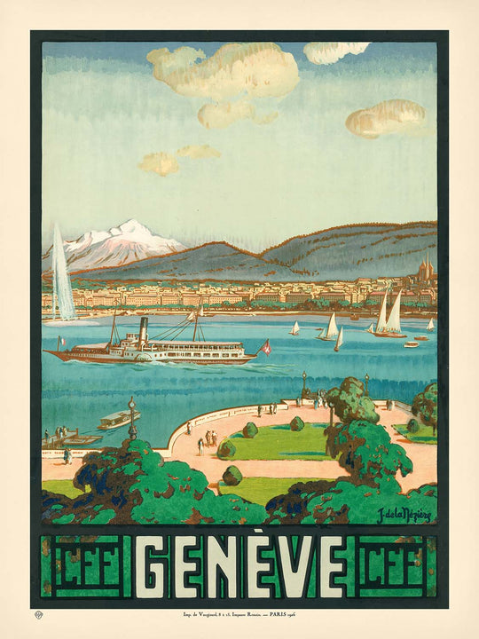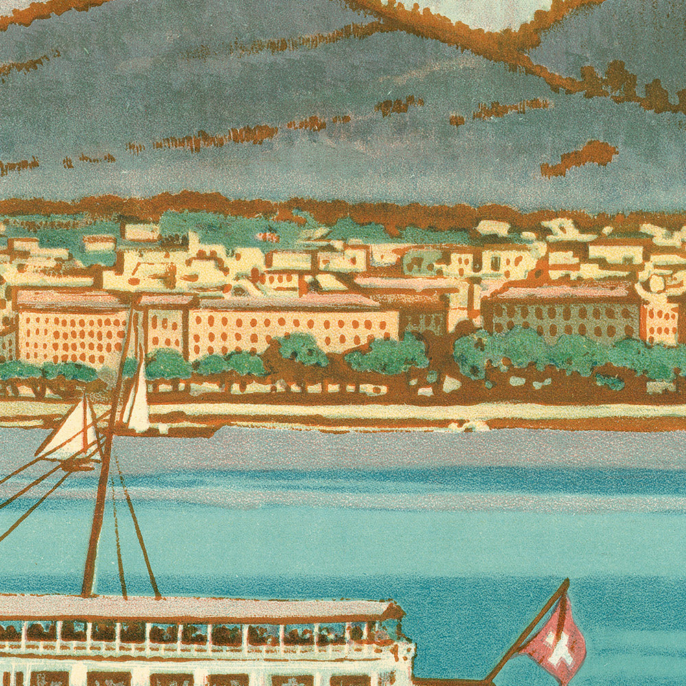 Geneva’s subject matter is timeless. The Jet d’Eau—already the city’s emblem by 1926—anchors the scene, while the calm sweep of lake and distant heights signals clear air, clean lines, and easy connections to the mountains beyond. Created just a few years after Geneva became home to major international institutions, the poster channels a post–World War I confidence: travel as civility, landscape as sanctuary, and the city as a welcoming gateway to Switzerland.