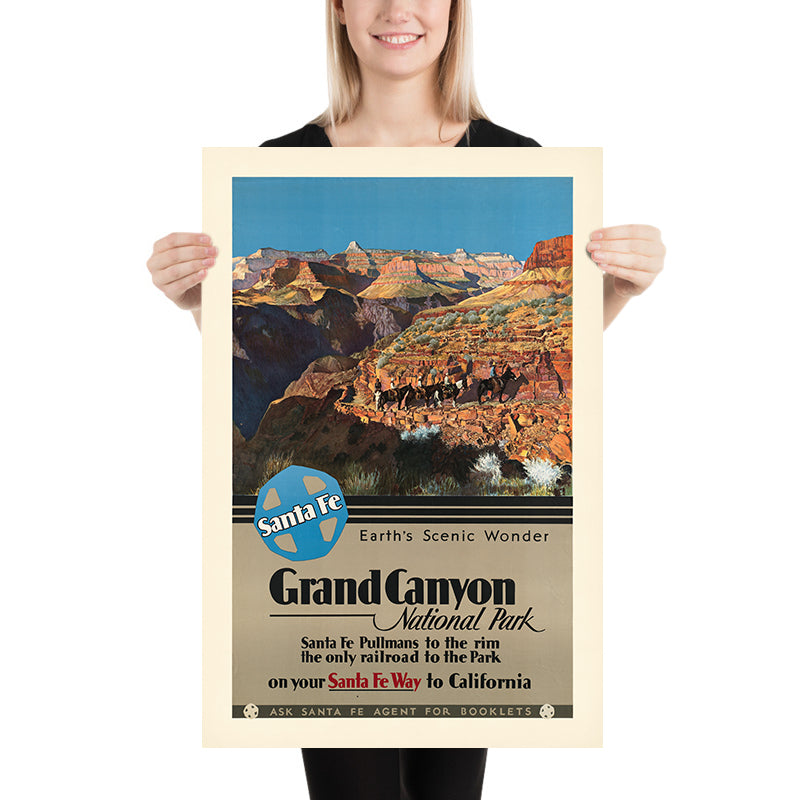 Grand Canyon National Park. Earth’s Scenic Wonder is a classic American travel poster created for the Santa Fe Railway by an anonymous studio artist. The composition captures a mule train threading a cliff‑hugging trail beneath a vast turquoise sky, while stepped mesas fade into cool blues beyond. Issued to entice travelers west, it distills the drama of Arizona’s South Rim into a single sunlit moment and pairs it with bold typography and the famous Santa Fe roundel.