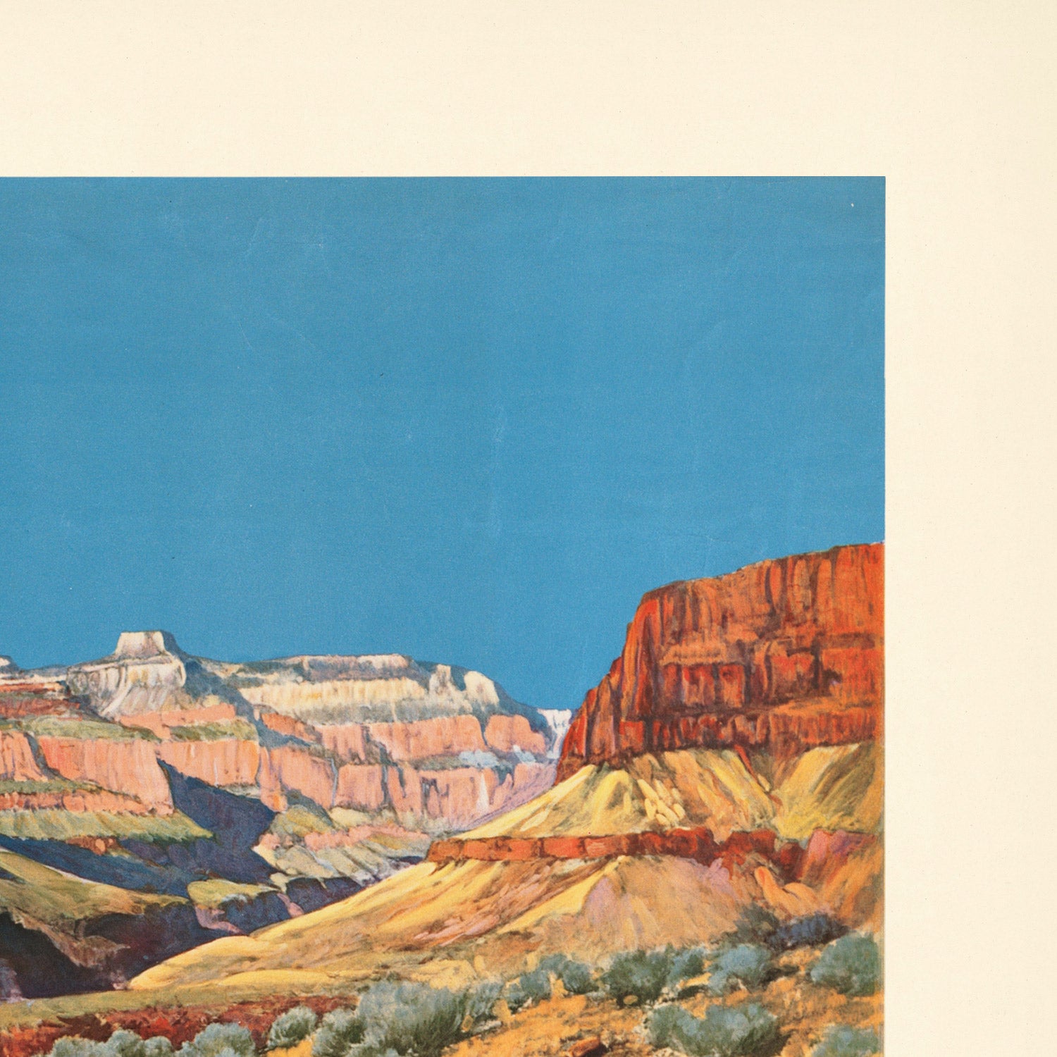 About the style: The palette—cerulean sky, russet and sienna cliffs, and pale beige sandstone—creates striking depth through atmospheric perspective. Strong, blocky letterforms for “Grand Canyon” contrast elegantly with the flowing script of “National Park,” while the circular Santa Fe emblem adds a pop of sky blue that echoes the heavens above the buttes. It’s a timeless statement piece for lovers of vintage typography, Western landscapes, and the romance of rail.