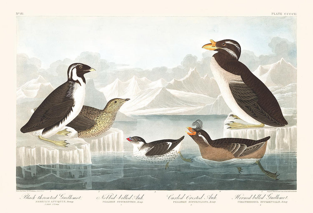 Black-throated Guillemot & Horned-billed Guillemot (plus a couple of Auks), first published in 1827, is by far the most interesting and charming illustration from John James Audobon's magnum opus, The Birds of America.