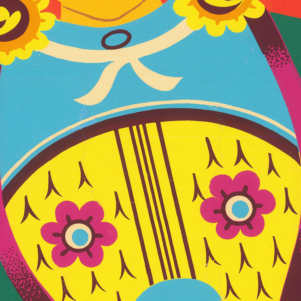 The palette is striking: saturated red, green, and yellow create a festive, high‑contrast composition with deep cultural resonance—red for luck, green for vitality and renewal, yellow for joy and prosperity. Decorative flourishes in the attire and traditional elements are rendered with crisp outlines and stylized detail, while broader, painterly strokes animate the background. Fluid curves meet geometric accents to suggest motion—like waves, banners, or the sweep of a ship’s wake—giving the poster a kinetic, celebratory energy. As wall art, it warms a space instantly and pairs beautifully with natural woods, lacquered finishes, brass accents, and both minimalist and maximalist interiors.