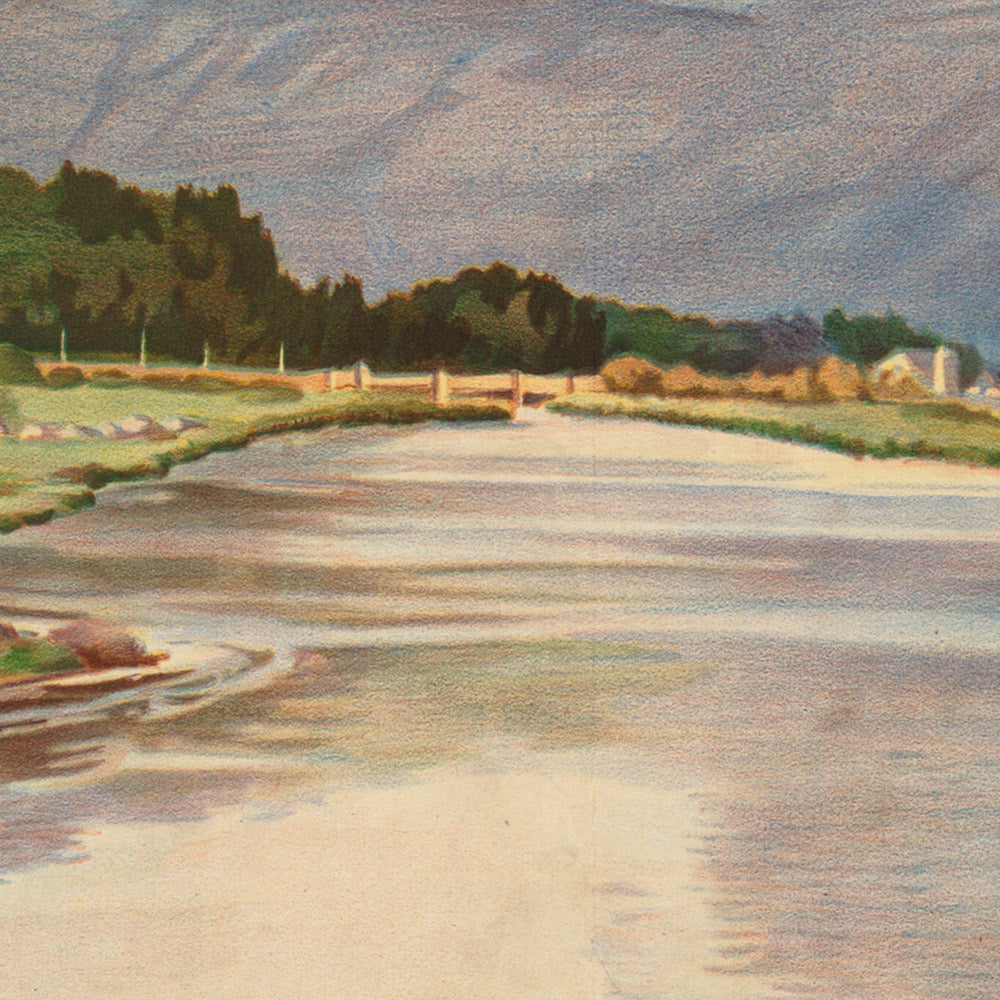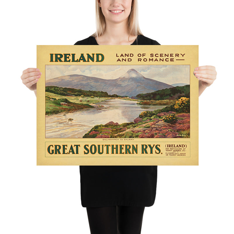 The subject is Ireland itself, portrayed as a place of serenity and romance. This was more than marketing—it was cultural storytelling that aligned with a broader post-Victorian enthusiasm for travel and the outdoors. As rail and steamship links expanded, posters like this welcomed visitors to explore Ireland’s lakes, rivers, and mountains, casting the countryside as timeless and restorative. For anyone with roots in Ireland, memories of a visit, or plans to go, the image evokes the hush of a riverside walk and the glow of late afternoon light on heathered slopes.