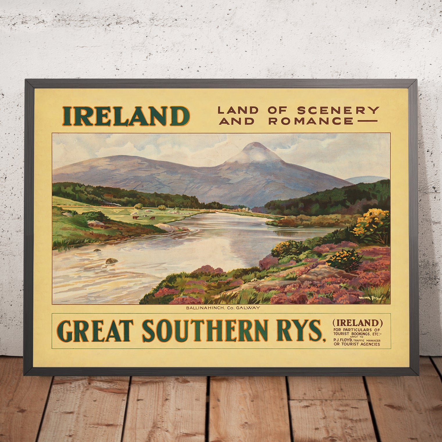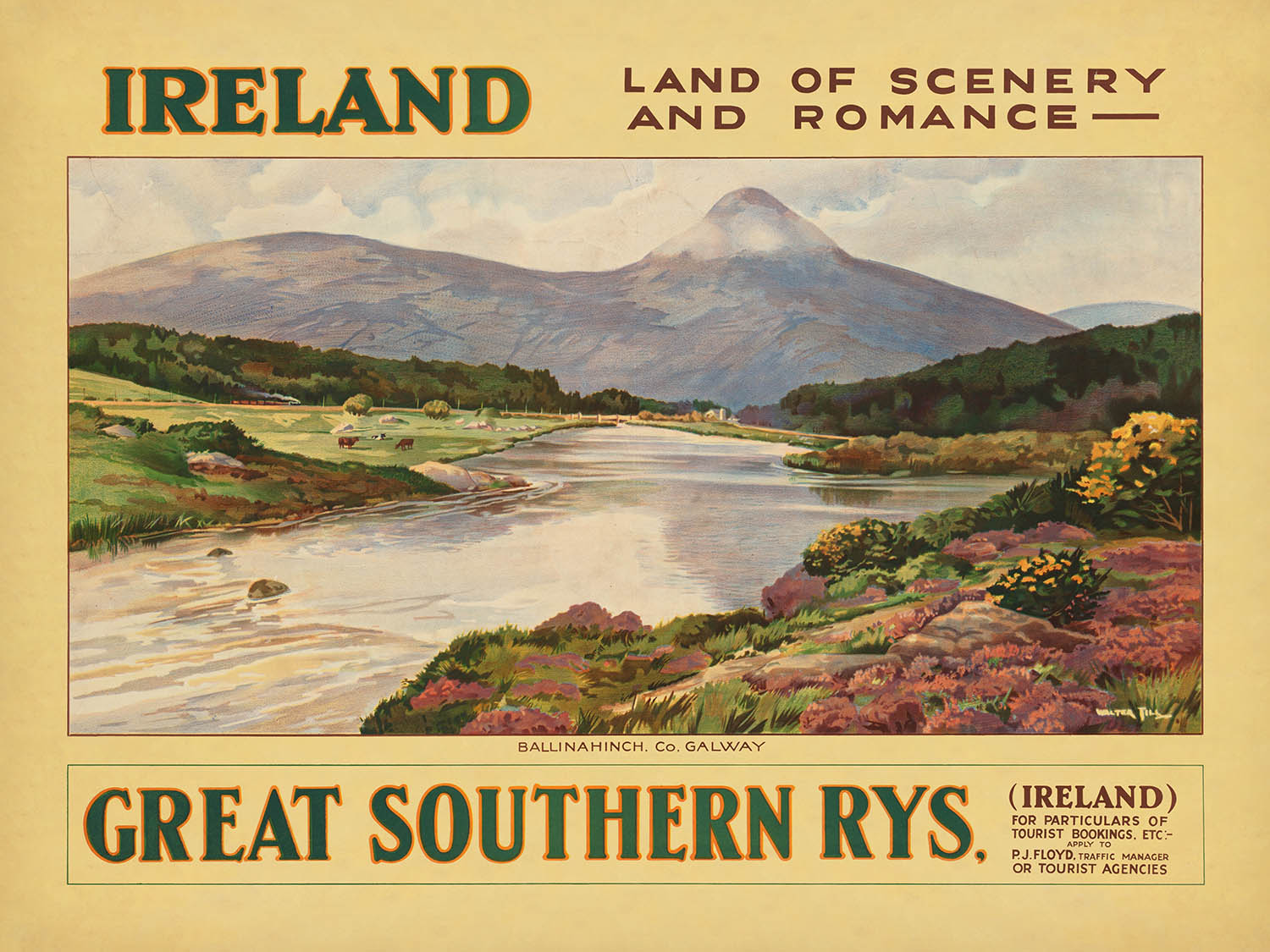 Ireland. Land of Scenery and Romance by Walter Till is a classic Irish travel poster that distills the island’s mythic beauty into a single, dreamlike view. Created in the early twentieth century, when railway publicity was at its zenith, it invites the viewer into a landscape of rolling green hills, a sinuous river, and a distant mountain glowing under a soft, welcoming sky. Walter Till’s imagery speaks to the romance that drew generations of travelers across the Irish Sea: quiet valleys, lyrical light, and the promise of discovery along country roads and waterside paths.