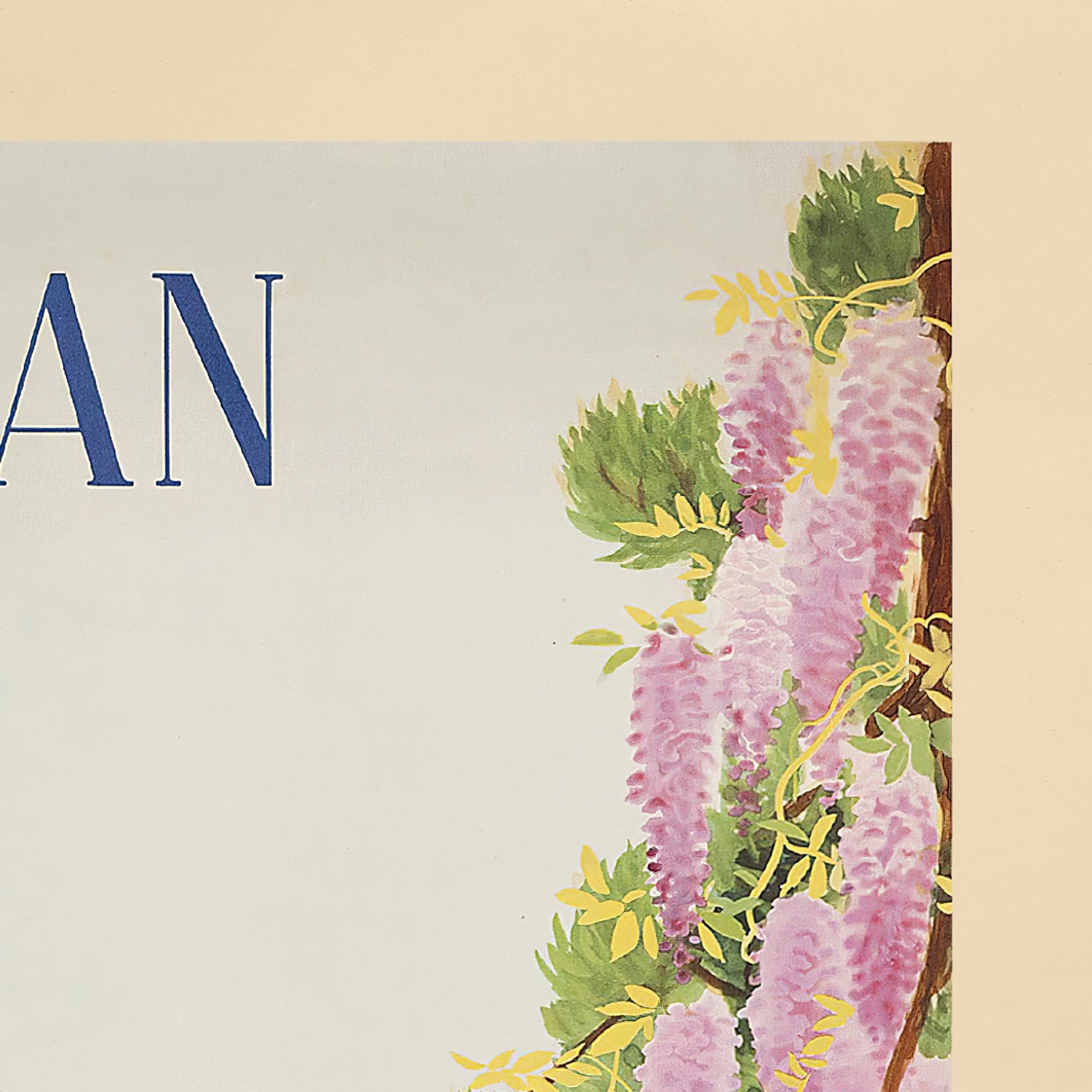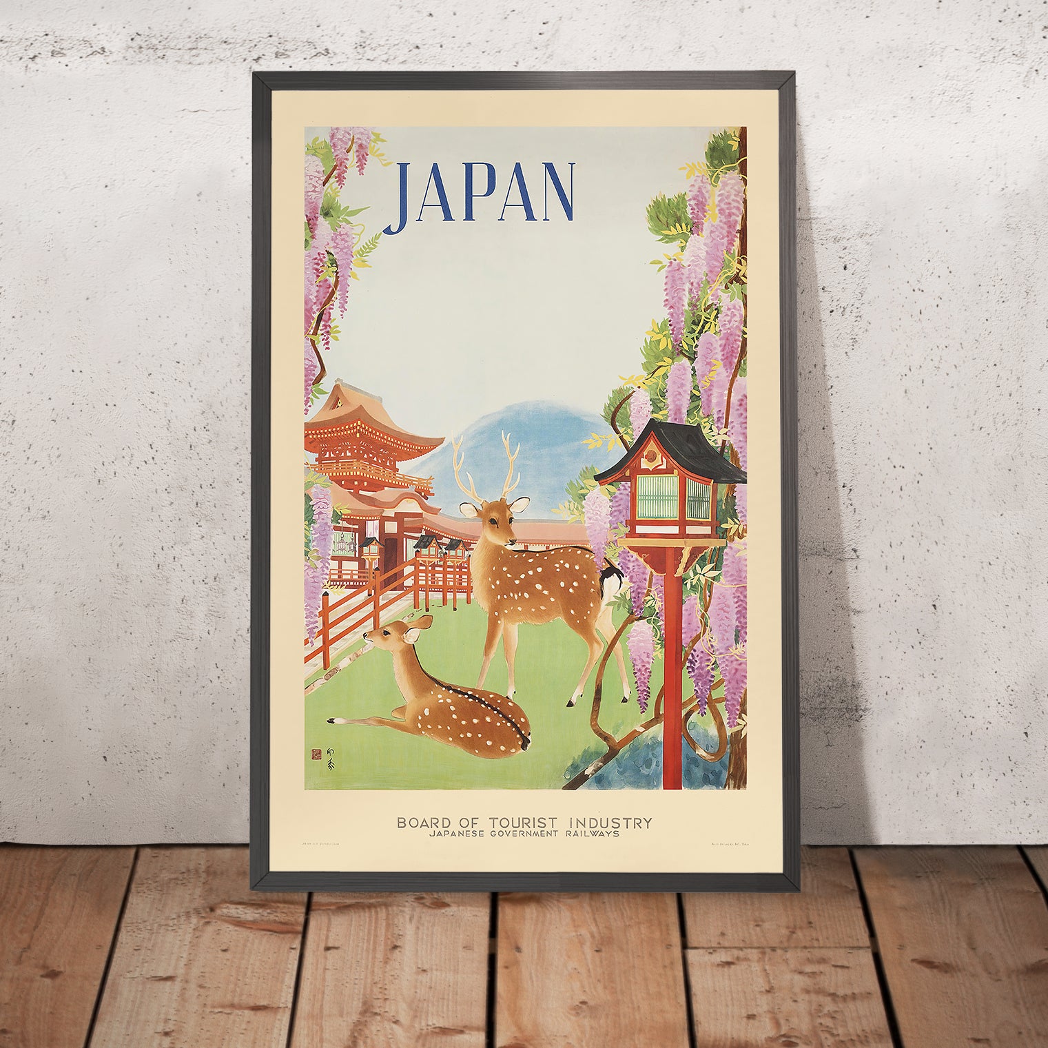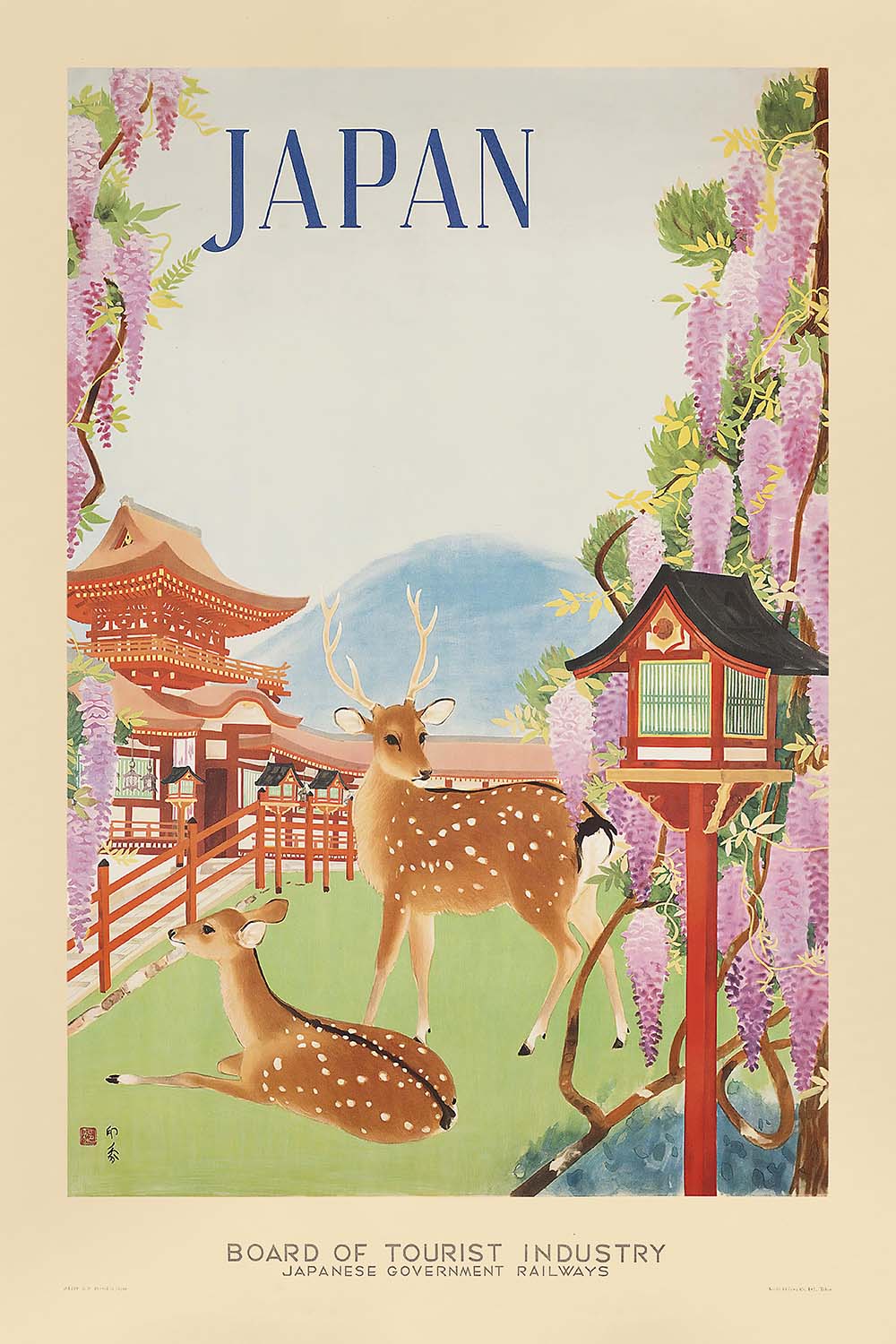Titled simply “JAPAN” and first published in 1934, this anonymous Shōwa‑era travel poster distills the quiet poetry of Nihonga—traditional Japanese painting—into a modern promotional image. Designed at a time when Japan balanced rapid modernization with pride in its cultural heritage, the poster invites the viewer into a serene landscape: wisteria blooms in soft pinks cascading over lush green foliage, a warm red pagoda anchoring the scene, and graceful deer symbolizing harmony with nature. The bold wordmark “JAPAN” underscores its purpose as an invitation to explore a country of timeless beauty.