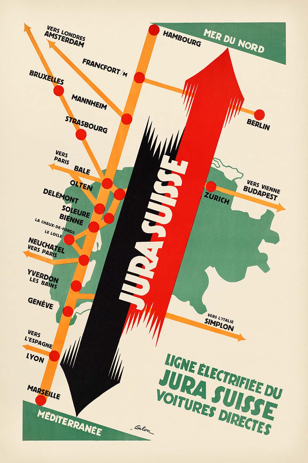 Jura Suisse. Ligne électrifiée du Jura Suisse voitures directes is a striking vintage travel poster by an anonymous designer working in the great Swiss tradition of modernist rail advertising. Set in the rugged, French‑speaking Jura region, the poster celebrates the speed and convenience of the area’s electrified railway and its direct coaches—inviting travelers to glide across forested plateaus and limestone ridges with elegant efficiency. The composition embraces the clarity and order that defined Swiss graphic design, turning route information into a compelling visual language for exploration.