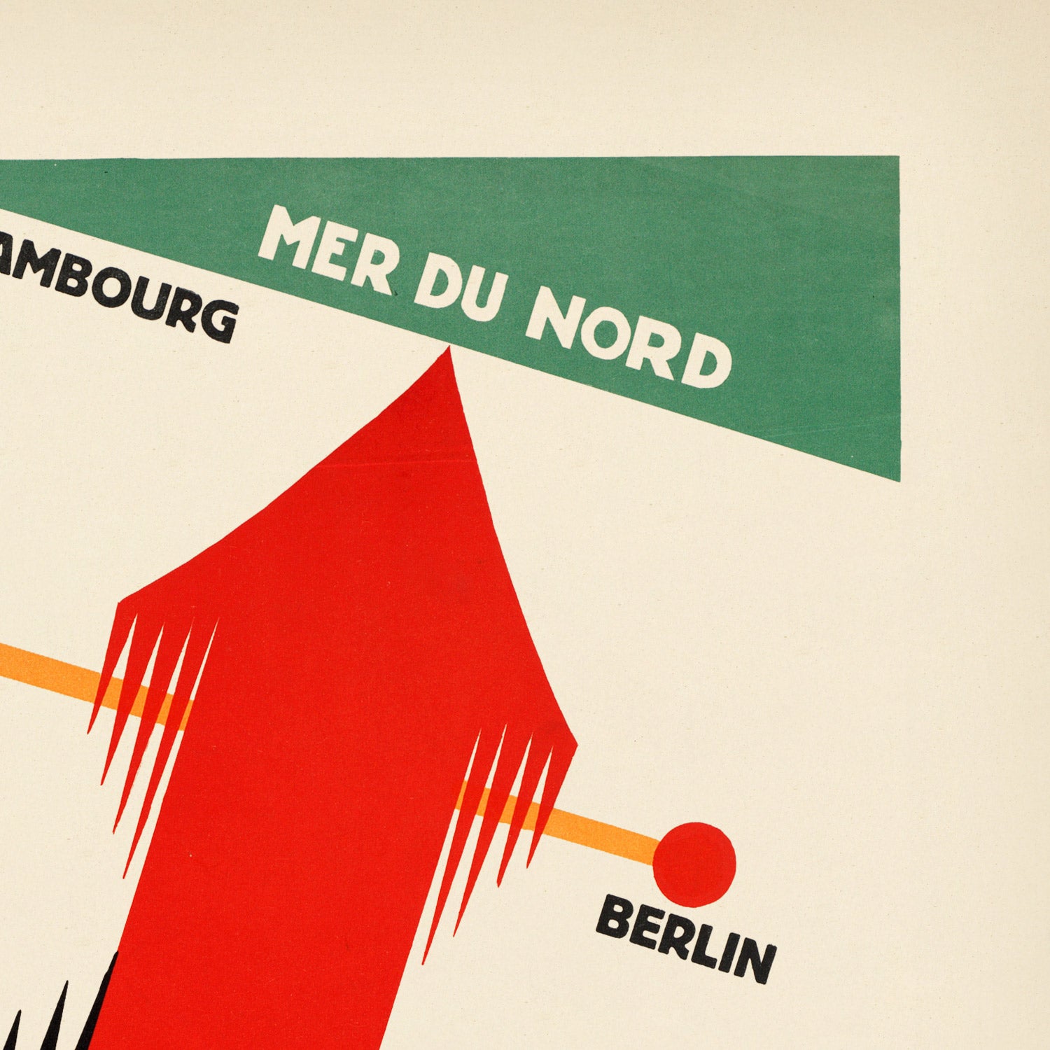 Design lovers will be drawn to the bold palette—dominant reds balanced by greens and deep blacks, with a touch of orange—set against a calm, neutral ground. Razor‑clean arrows, geometric lines, and precise circular nodes transform the rail routes into a dynamic diagram of movement. The sans‑serif typography is strong and spare, projecting universal legibility while lending the piece a timeless, mid‑century poise. It’s a perfect blend of function and form: a poster that mapped the way and made you want to go.