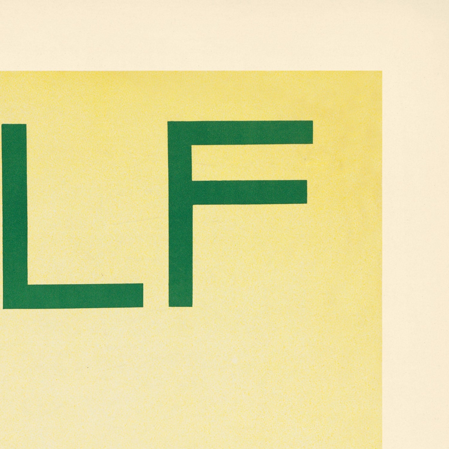 Golf. Lausanne, 1936, is a classic Swiss travel poster from the interwar golden age of tourism, created by an anonymous studio illustrator and printed in Lausanne. Designed to entice golfers to the shores of Lake Geneva, it marries the glamour of sport with the grandeur of the Alps. The poster is unmistakably of its era: bold sans‑serif lettering, simplified forms, and crisp lithographic color. At the top, the single word “GOLF” in deep green commands the lemon‑yellow sky; below, the landscape rolls toward a silver-blue lake and serrated alpine peaks. A small note at lower right—“18 holes 6000 y”—speaks directly to enthusiasts, promising a full championship course against a spectacular backdrop.