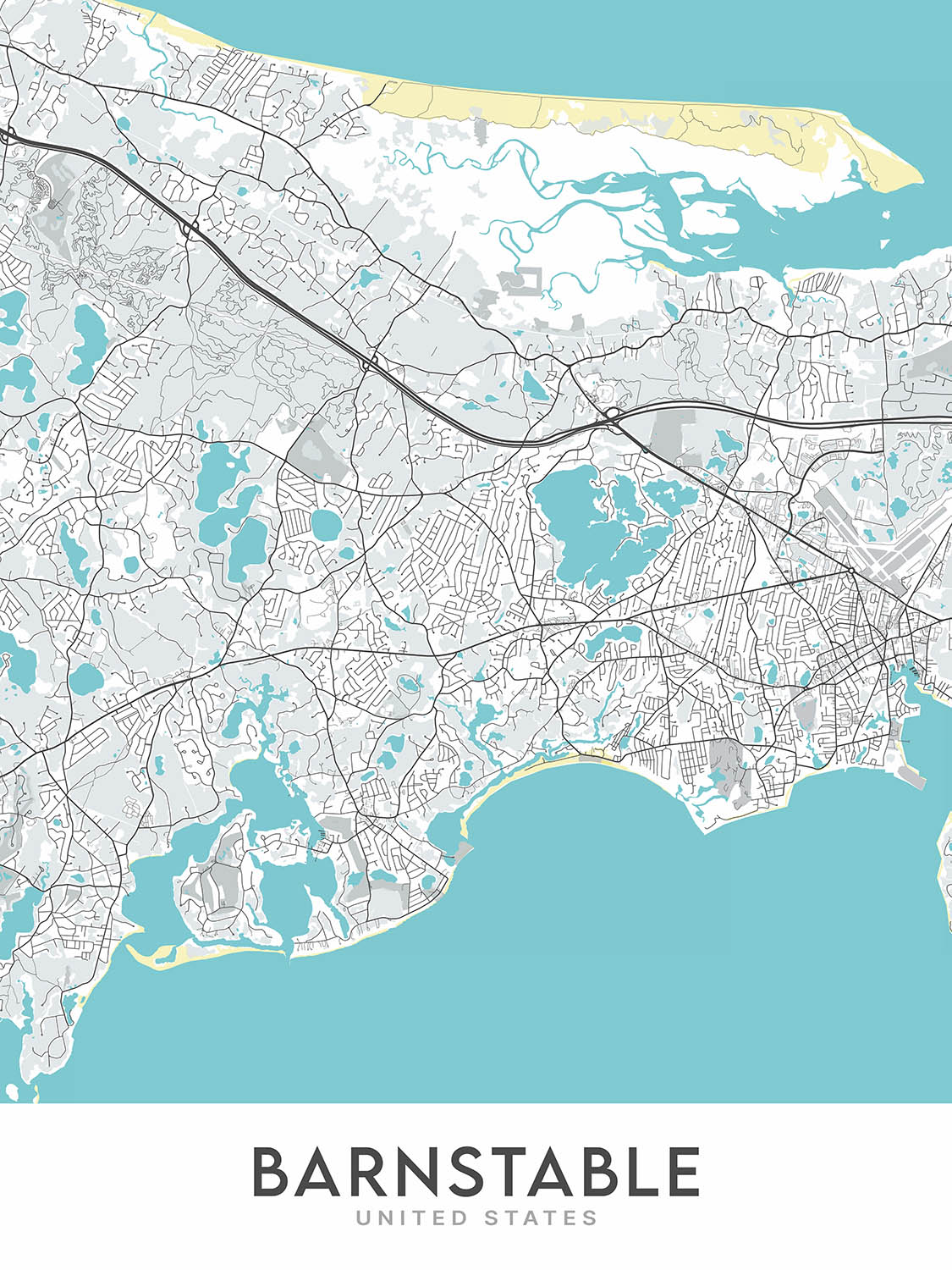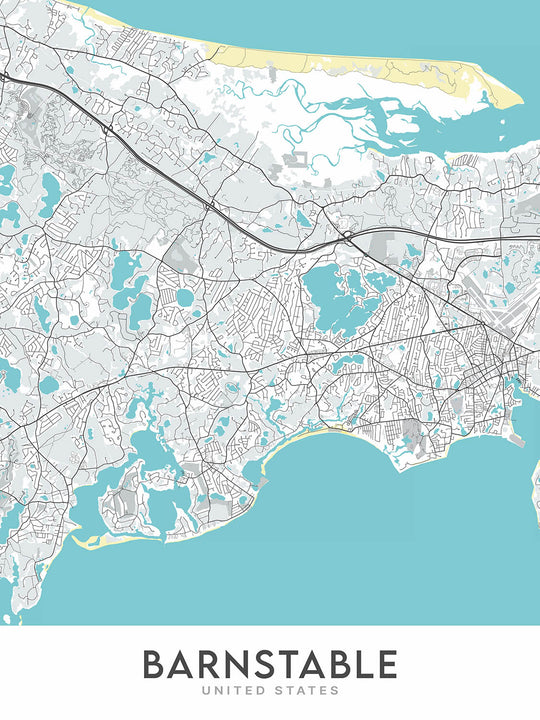 The Barnstable map is a modern, detailed street map that focuses on the city of Barnstable in Massachusetts. It is a beautiful and informative piece of art that is perfect for any home or office. The map covers a large area, extending approximately 9 miles to the north and south of the city center, and 7.5 miles to the east and west. This means that the map includes many of the city's most popular neighborhoods, including Barnstable Village, Centerville, Cotuit, Hyannis, Hyannis Port, Marstons Mills, Osterville, West Barnstable, and Yarmouth Port.