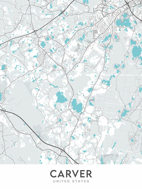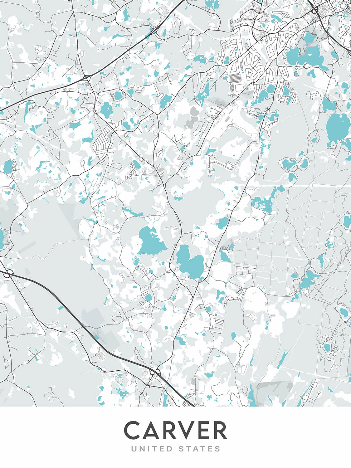 This modern map of Carver, Massachusetts, is a beautiful and informative work of art that will make a stylish addition to any home or office. The map focuses on the city of Carver and its surrounding areas, providing a detailed look at the city's streets, neighborhoods, and landmarks. The map covers an area of approximately 10 miles from west to east and 11 miles north to south, with the city of Carver located near the center of the map.