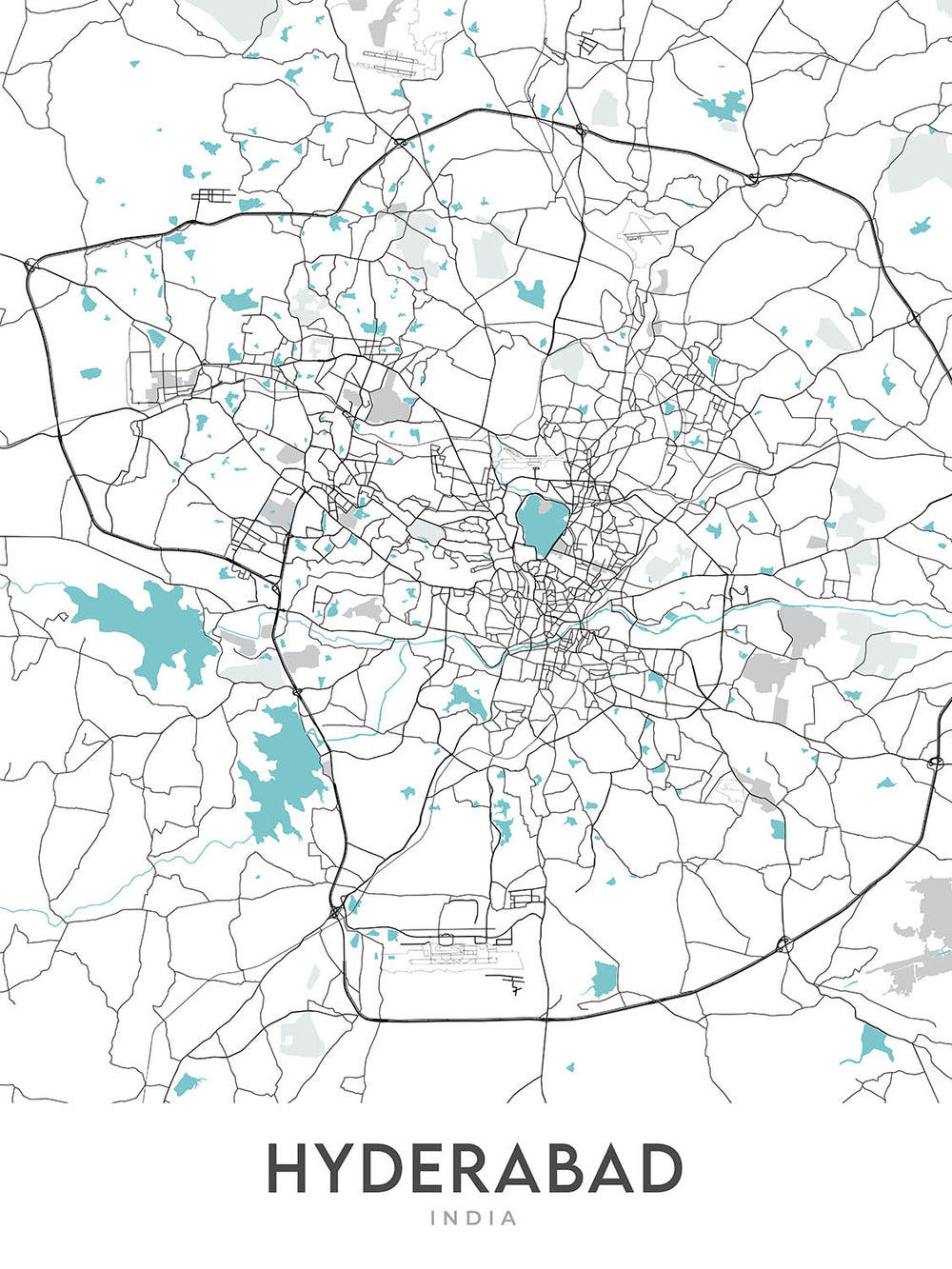 Perfect for enhancing the ambiance of any space, this map serves as both a decorative element and a conversation starter. Its sleek, modern design complements a variety of interior styles, from minimalist to eclectic. Whether displayed in a living room, study, or office, it adds a touch of sophistication and a hint of wanderlust. The map's ability to transform a space lies in its balance between aesthetic appeal and the intriguing complexity of Hyderabad's street network.