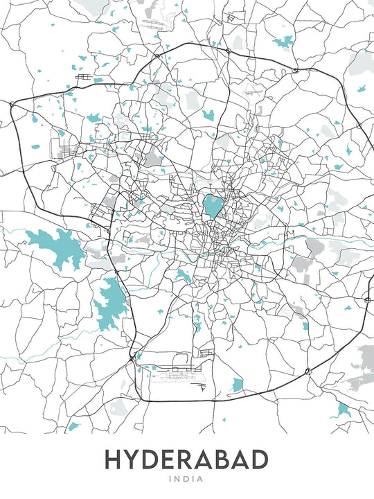 The map also captures some of Hyderabad's most notable landmarks, adding another layer of interest to its design. The presence of the serene Hussain Sagar Lake, the lush KBR National Park, and the bustling HITEX Exhibition Center are all represented within the map's boundaries. Each landmark is depicted through the subtle interplay of lines and colours, inviting viewers to explore the city's diverse geographical and cultural landscape. This artistic representation of Hyderabad's landmarks makes the map an ideal gift for those with a connection to the city or a passion for travel.