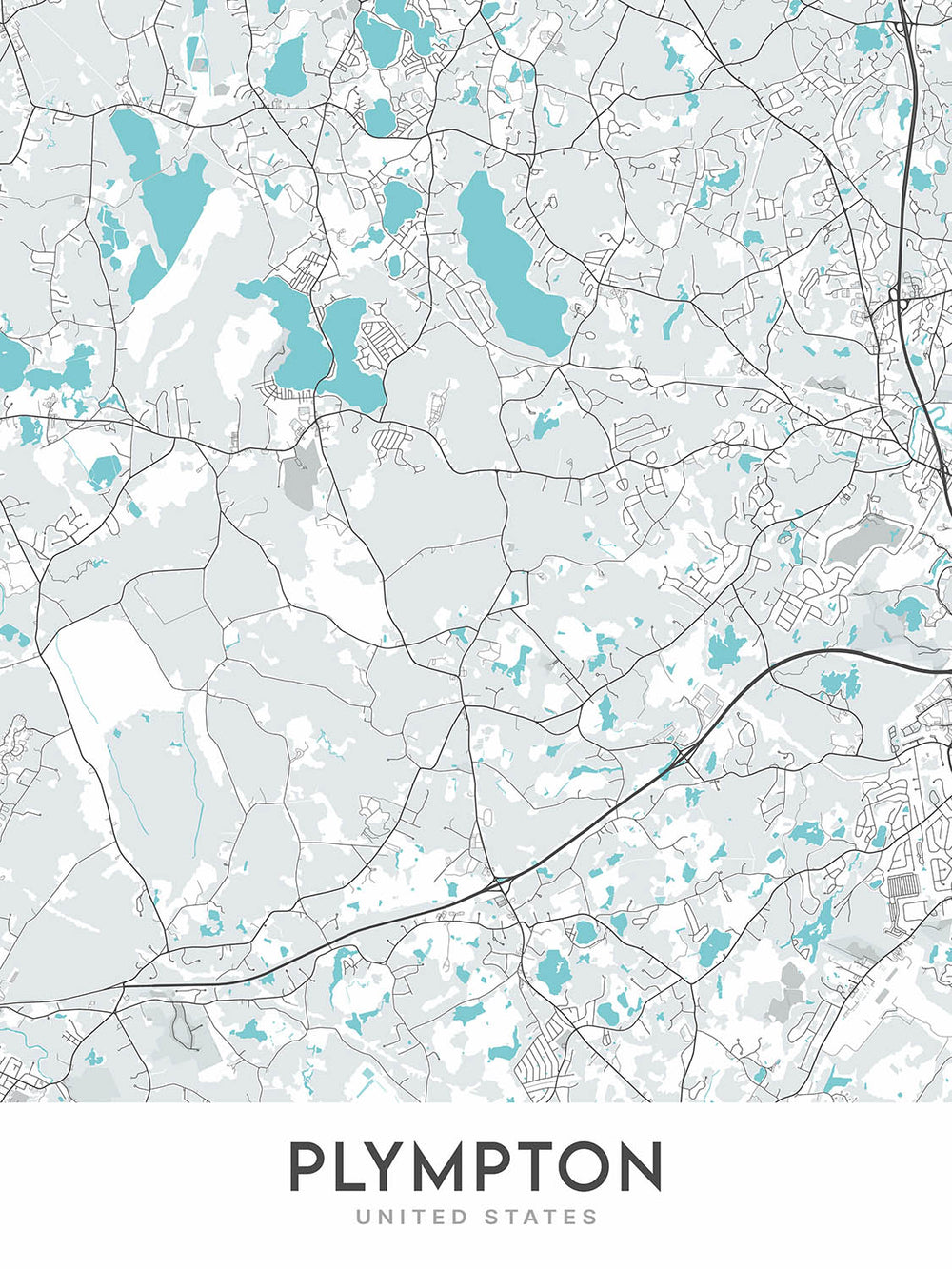This modern map of Plympton, Massachusetts, is a detailed and stylish representation of this charming New England town. The map covers a generous area, extending approximately 9 miles to the north and south of the town center, and 7.5 miles to the east and west. This ensures that all of Plympton's most notable neighborhoods, landmarks, and thoroughfares are captured in meticulous detail.