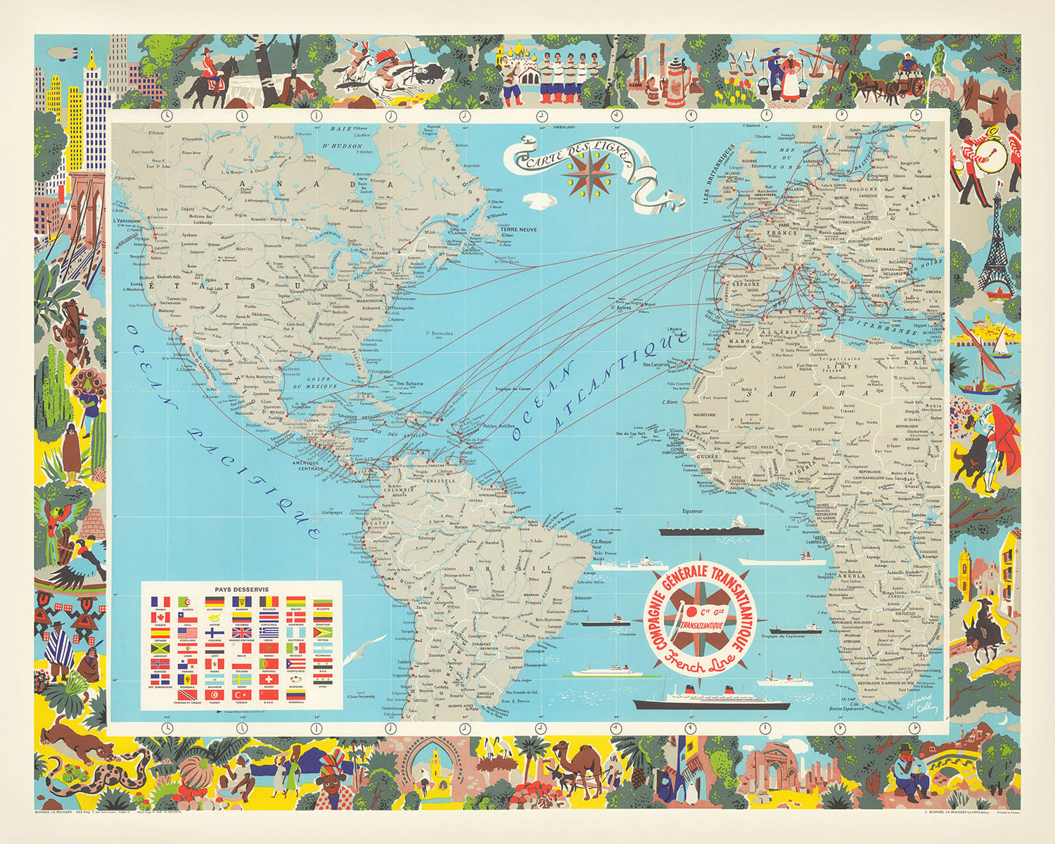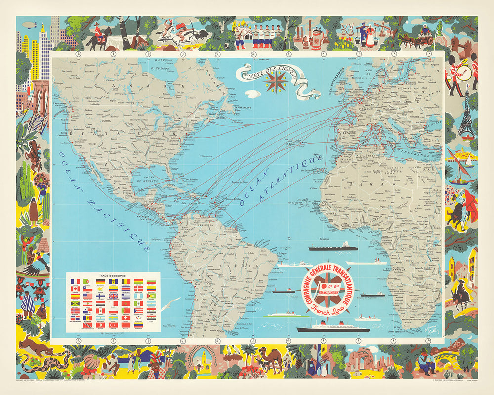 The map’s design is a harmonious blend of functionality and artistry. The use of vibrant colors to highlight shipping routes and the inclusion of national flags and a table of countries served by the Compagnie Generale Transatlantique add layers of information that are both engaging and educational. The pictorial elements, such as the illustrations of liners and cultural scenes, provide a narrative that goes beyond geographical data, offering a glimpse into the world of international travel and trade during the mid-20th century.