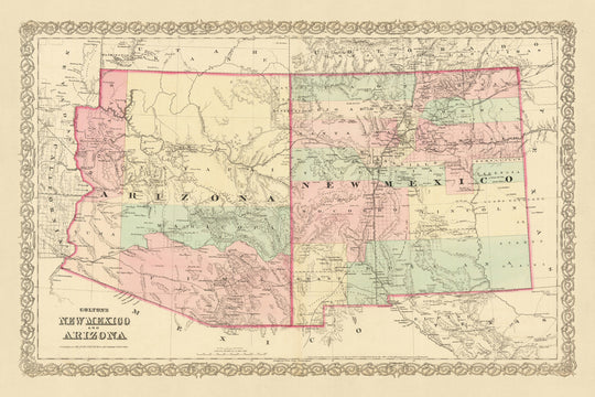 Immerse yourself in the rich history of the United States with this meticulously crafted 1873 map of New Mexico and Arizona, produced by renowned mapmaker J.H. Colton. This exquisite piece provides a rare glimpse into the early development of these regions, at a time when many settlements were still in their infancy and the landscape of the United States was rapidly evolving. As one of the finest American mapmakers of his era, Colton's work is characterized by its exceptional attention to detail and accuracy, offering a unique window into the past.