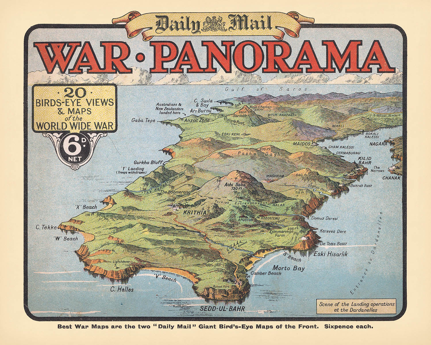 Scene of the Landing Operations at the Dardanelles, issued in 1916 by the London Geographical Institute for the Daily Mail War Panorama, captures the opening drama of the Gallipoli campaign in a vivid bird’s-eye sweep. The strait itself—narrow, sinuous, and fiercely contested—links the Aegean to the Sea of Marmara, and beyond to Constantinople, the great strategic prize of the Allied plan. With painterly color and disciplined labeling, the view translates war dispatches into geography: promontories and bays become stages for landings, ridgelines morph into natural ramparts, and the distances that baffled readers shrink into coherent sightlines. It is both a report and a narrative, shaping the public’s understanding of how sea, cliff, and village conspired to influence every advance and setback.