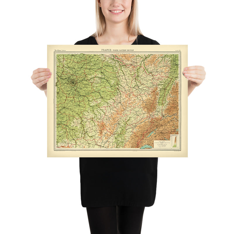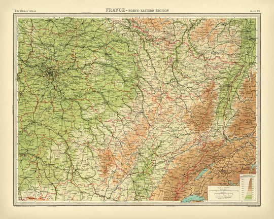 France - North-Eastern Section is the lucid, modern title crowning J. G. Bartholomew’s 1922 contribution to The Times atlas, a sheet that exemplifies the great early-20th-century shift in cartographic design. Issued as the second state of the 1920 edition, it moves decisively beyond the Andree tradition of 1895 toward a cleaner visual grammar and greater empirical precision. Bartholomew’s palette of hypsometric tints makes the land legible at a glance, while bathymetric washes set the maritime margins into quiet relief. Around Paris and across the plains and uplands of northeastern France, finely graded color, a rigorous symbol system, and clearly annotated shipping routes and distances come together to create an atlas map equally hospitable to the armchair scholar and the practiced navigator.