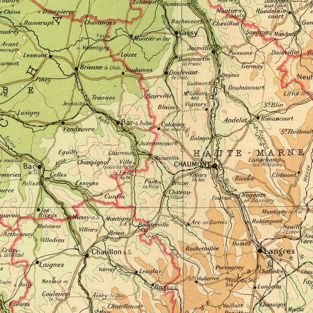 The map’s topography is a study in contrasts. The Seine basin unfurls in gentle greens about Paris, its tributaries—the Marne and Oise—traced with crystalline certainty. Northward, the chalky plateaus of Picardy lean toward the Somme; eastward, the open Champagne plain around Reims yields to the firmer undulations of the Argonne and the forested shoulders of the Ardennes. Farther southeast, the Moselle valley gathers Nancy and Metz before coursing toward the Rhine, while the Meuse carves its own cool corridor. Hypsometric tints cue the ascent from lowland river corridors to plateau and upland; subtle contouring and shading make watersheds and escarpments legible. Along the Belgian and Luxembourg frontiers—and the reconfigured borderlands of Lorraine—the political line respects the shape of the land it crosses.