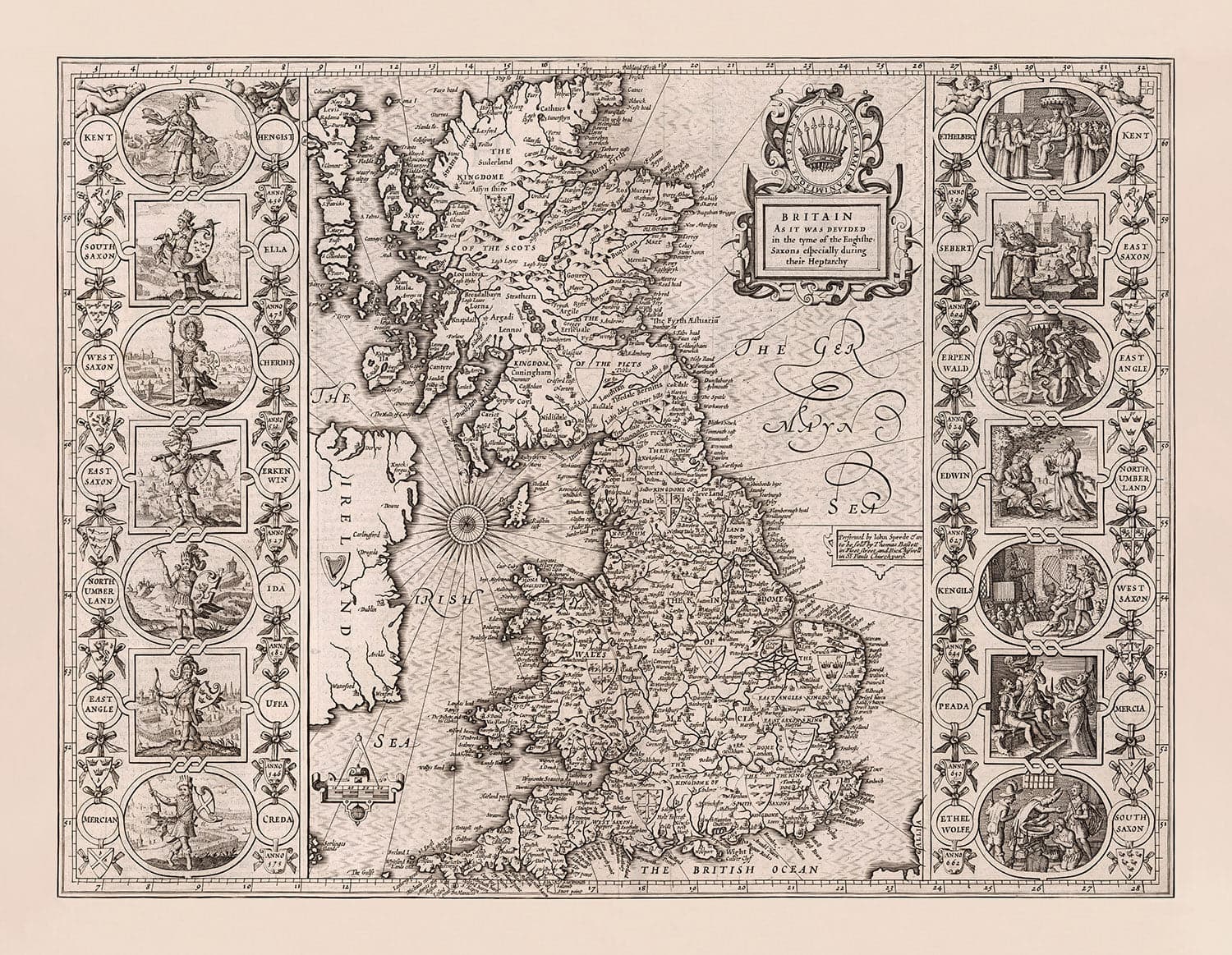 Old Viking Map of England, Wales & Scotland, 1611 by John Speed: Anglo-Saxon Heptarchy Map of Great Britain