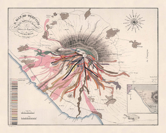 Map of Vesuvius showing the direction of the streams of Lava in the Eruptions from 1631 AD to 1831 A.D. is a rare marriage of scientific precision and lyrical design. John Auldjo orchestrates two centuries of fiery history into a legible symphony of color, each ribboned flow keyed to its year and coursing down the flanks of Vesuvius. An elegant, ornate cartouche frames the title, while a crisp legend clarifies the chronology and behavior of eruptions across the seventeenth to early nineteenth centuries. The map reads like a field notebook made beautiful: annotated paths, carefully distinguished periods, and an inset situating the volcano within the broader Bay of Naples. In Auldjo’s hands, the mountain’s episodic violence becomes a coherent visual narrative—one that invites both contemplation and close study.