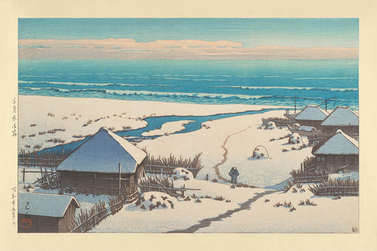 Hasui Kawase is celebrated for his masterful depiction of Japan’s atmospheric moods and his exceptional ability to capture light and shadow play, a skill evident in this woodblock print. "Onjuku, Chiba Prefecture" captivates with its use of blue and white, enhanced by subtle brown tones that articulate the fishermen's boats against the softly striated sky and sea. The hues and design invite you into a realm of calm contemplation, making it an absolute delight to own.