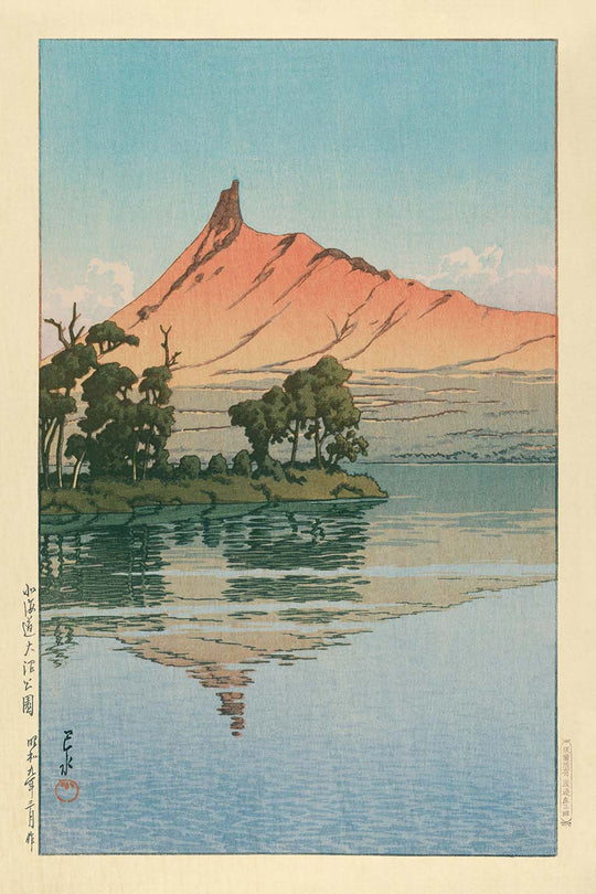 Onuma Park in Hokkaido by Hasui Kawase is a quintessential piece that embodies the refined artistry of this celebrated Japanese woodblock printmaker. Created in 1935, the work captures the serene beauty of Onuma Park in Hokkaido, pervaded by the tranquil interplay of blue and orange hues reflective of the natural landscape. Hasui Kawase, a prominent figure in the Shin-Hanga movement, is renowned for his capacity to blend traditional techniques with Western artistic influences, resulting in breathtaking landscapes that evoke a sense of peaceful contemplation.