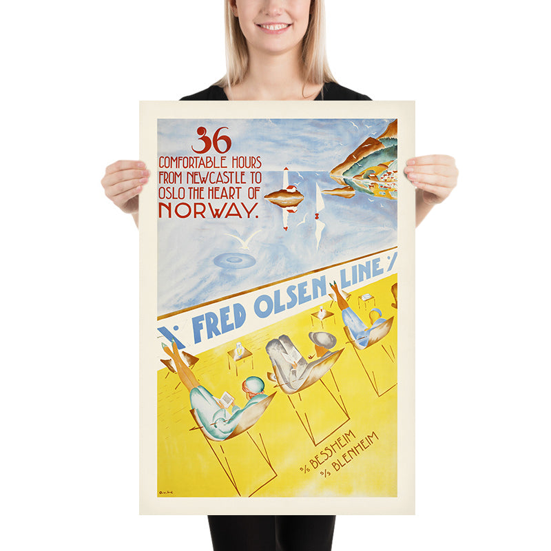 Otto von Hanno’s Fred. Olsen Line is a classic Norwegian travel poster inviting British passengers to sail “36 comfortable hours from Newcastle to Oslo, the heart of Norway.” Likely produced in the interwar era, it captures the romance of crossing the North Sea to the Oslofjord. A crisp diagonal divides the composition: above, a pale blue fjord with mirrored cliffs, tiny harbor houses, and red‑tipped navigation buoys; below, a sunlit deck where three stylish travelers lounge in sling chairs, reading as the ship glides onward. The artist’s monogram “O.v.H.” appears at lower left, and the ships “s/s Bessheim” and “s/s Blenheim” are named at the lower right.