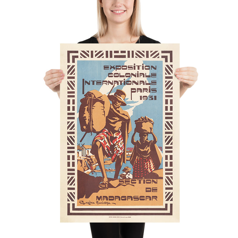Exposition Coloniale Internationale, Paris 1931 – Section de Madagascar by Razana Maniraka is a striking interwar travel poster created for the celebrated Paris exhibition of 1931. Maniraka centers two Malagasy figures—one striding forward with a bundled load, the other balancing a basket—set against a pale-blue sky and a busy waterfront. The scene is framed by a bold geometric border and crisp Art Deco typography that spells out “Exposition Coloniale Internationale Paris 1931” and “Section de Madagascar.” The poster captures the era’s fascination with distant places while offering a vivid snapshot of how Madagascar was presented to the world in Paris that year.