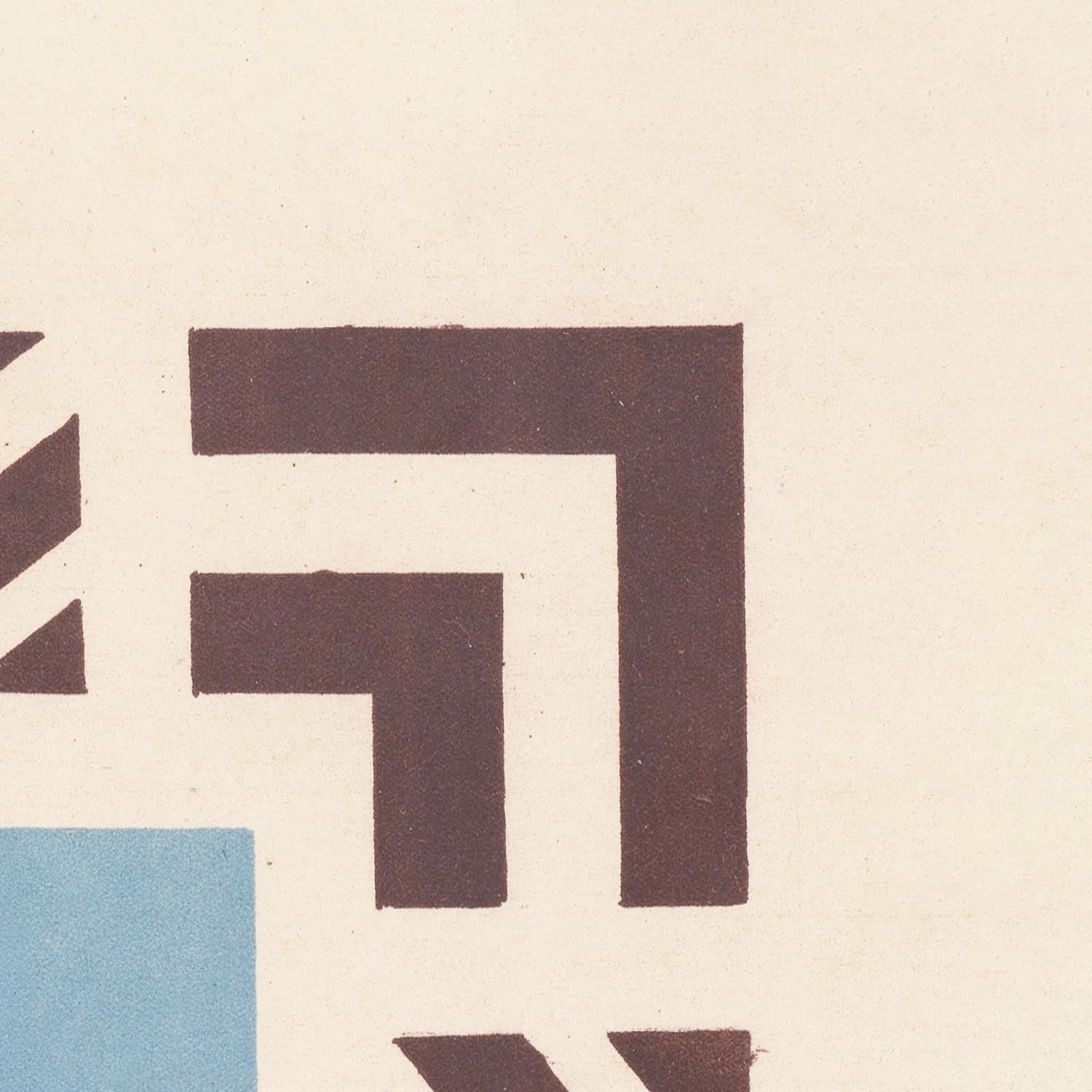 About the style and color: The palette is a harmonious blend of sky-blue, warm ochre-beige, and deep cocoa brown, punctuated by red accents in the patterned garments. The stepped, rhythmic border and the angular folds of the figures’ clothing lend the image a sculptural quality. The composition’s upward stride and layered harbor scene create a sense of movement and purpose—qualities that make this an eye-catching focal point in contemporary interiors, from modernist living rooms to eclectic home offices.
