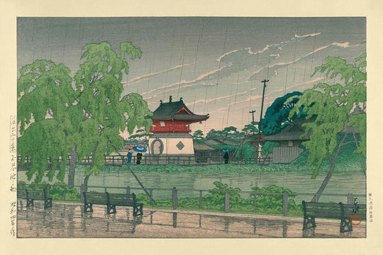 "Rain at Shinobazu Pond," a mesmerizing woodblock print crafted in 1935 by Hasui Kawase, captures the tranquil beauty of traditional Japanese landscapes. Hasui Kawase, a prominent figure in the Shin-Hanga movement, is revered for his revitalization of ukiyo-e woodblock printmaking, blending dynamic Western art influences with classic Japanese techniques.