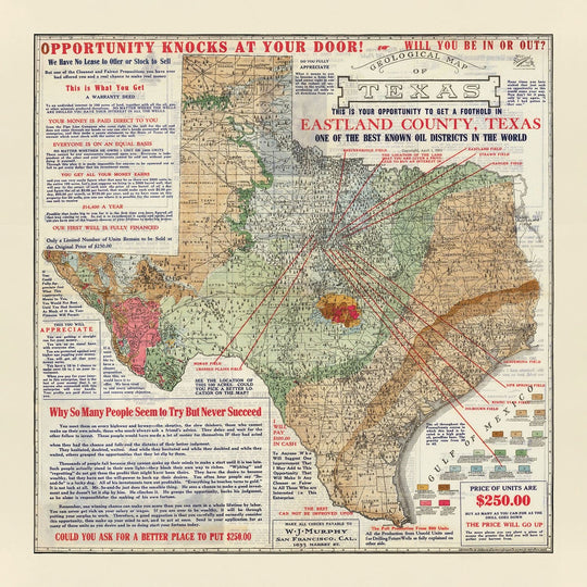 At the time, a huge amount of oil had just been discovered in Eastland county and an oil boom ensued. Promotional materials like this map were being widely distributed, telling investors across the US, "opportunity knocks at your door - will you be in or out?"