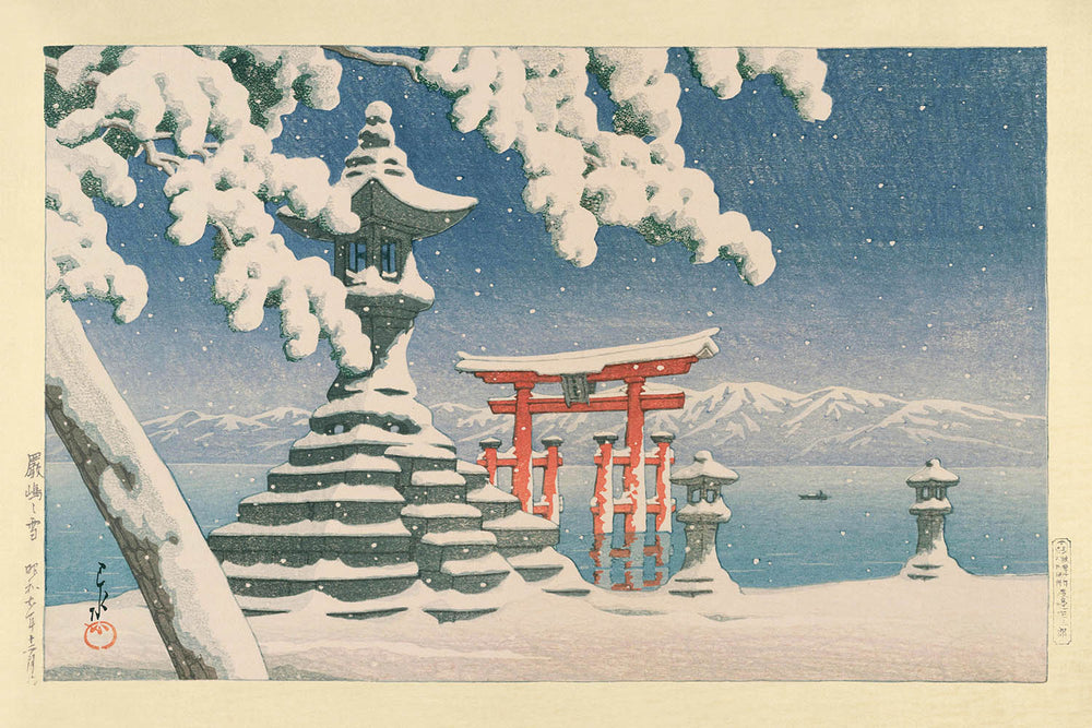 Hasui Kawase was a notable artist in the early 20th century, revered for his ability to infuse traditional Japanese aesthetics with Western art elements, resulting in pieces that are both timeless and captivating. Snow at Miyajima stands out for its delicate depiction of snow-covered landscapes, which perfectly convey the serene beauty of the scene as snowflakes adorn the classic architecture and the natural surroundings.