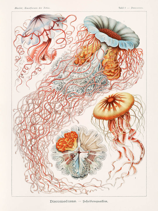 The "Discomedusae Scheibenquallen" illustration is part of his celebrated series that combines aesthetic beauty with biological accuracy. The vivid colours and detailed structures of the jellyfish in this piece showcase Haeckel’s masterful use of gradation and form, with hues ranging from deep blues to radiant oranges, creating a sense of wonder and fascination.