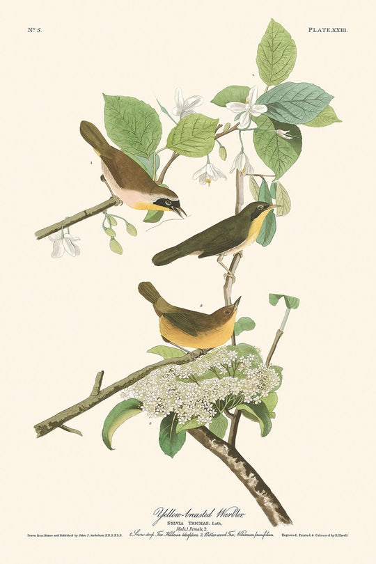 John James Audubon's exquisite illustration, "Yellow-breasted Warbler," first published in 1827, is a wonderful addition to his monumental series "Birds of America." Known for capturing the essence of bird species through detailed and vibrant imagery, Audubon’s work continues to be celebrated by ornithologists and art enthusiasts alike.