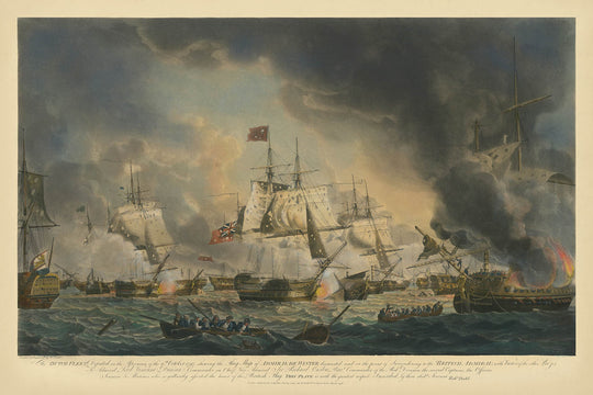 Visually striking, this aquatint is remarkable for its bold use of color and dramatic contrasts. Rich, deep blues and smoky grays dominate the stormy sea and sky, punctuated by vibrant accents of fiery orange and red from burning ships. At the heart of the composition, the British fleet proudly displays the Union Jack, a luminous symbol of victory amidst the chaos. The foreground, filled with small rescue boats navigating the turbulent waters to save their comrades, adds an emotional depth and human dimension to the scene.