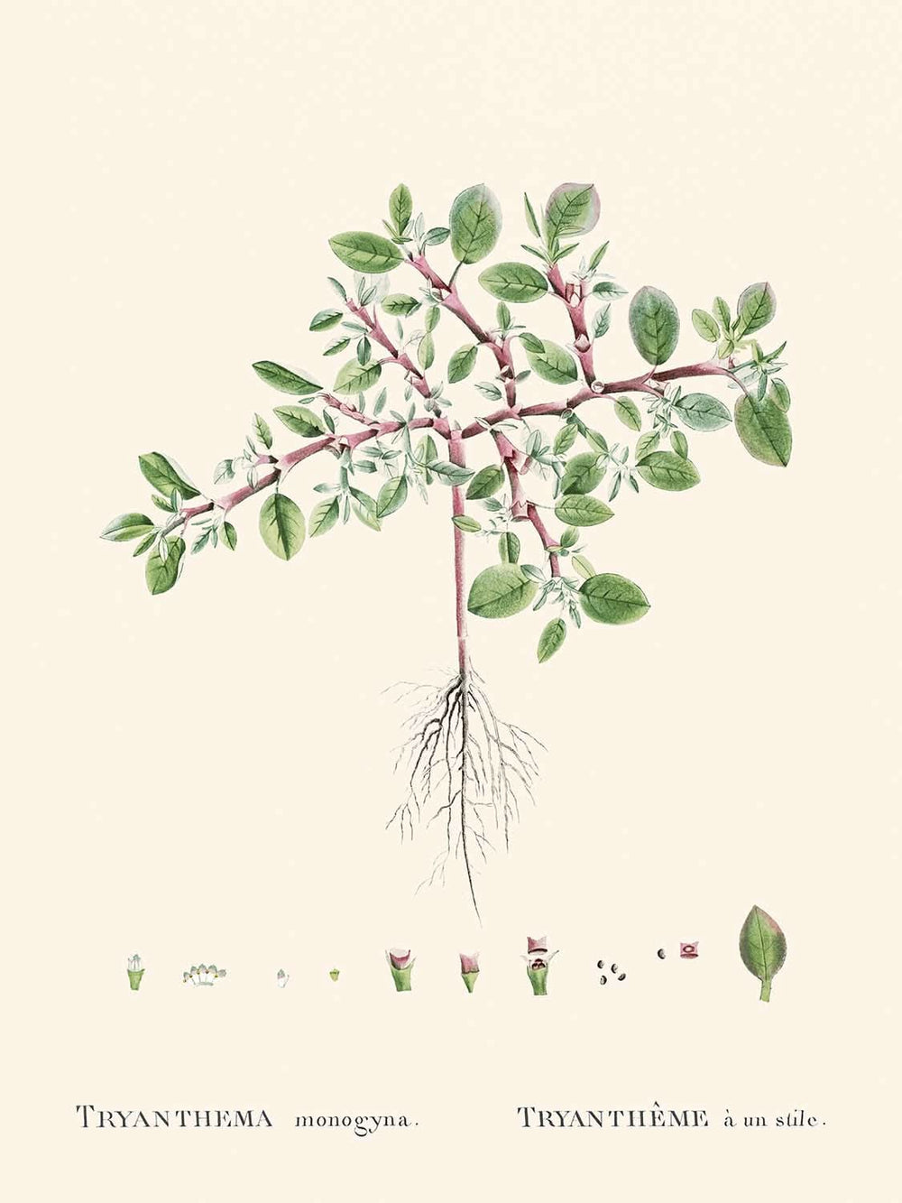 Desert Horsepurslane, originally titled Trianthema Monogyna, was first published in 1802. This exquisite Victorian botanical illustration is the work of Pierre-Joseph Redouté, one of the most celebrated botanical illustrators in history. Born in Belgium, Redouté found early artistic success as the painting tutor to Marie Antoinette. Later, at the request of Josephine Bonaparte, the wife of General Napoléon, he devoted much of his life to painting the flowers of Château de Malmaison. His commitment to botanical art led him to achieve a prolific output of over 2,100 botanical paintings, documenting more than 1,800 different species.