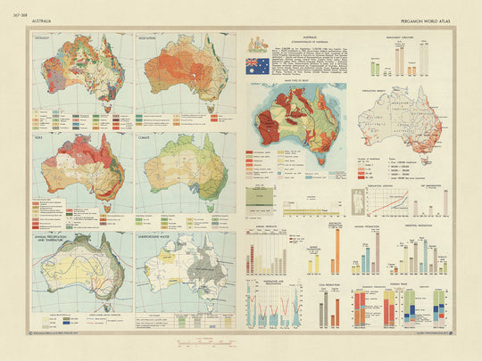 Old Infographic Map of Australia, 1967: Agriculture, Geology, Employment, Climate, Groundwater, Foreign Trade