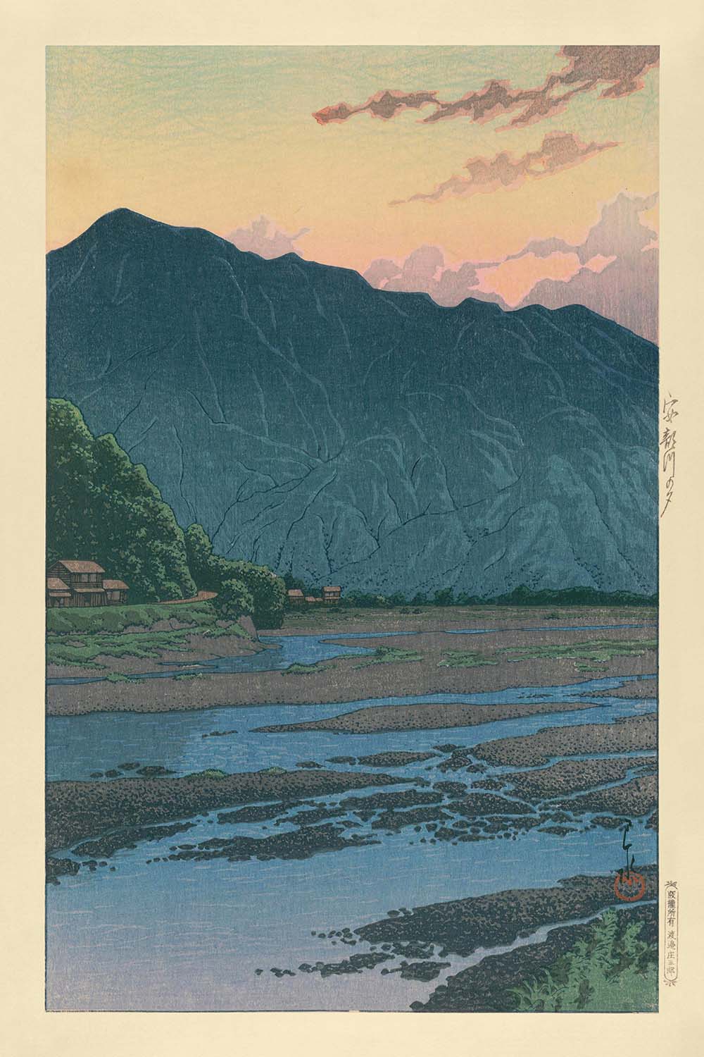 Mountain Sunset and Muddy River by Hasui Kawase, 1935