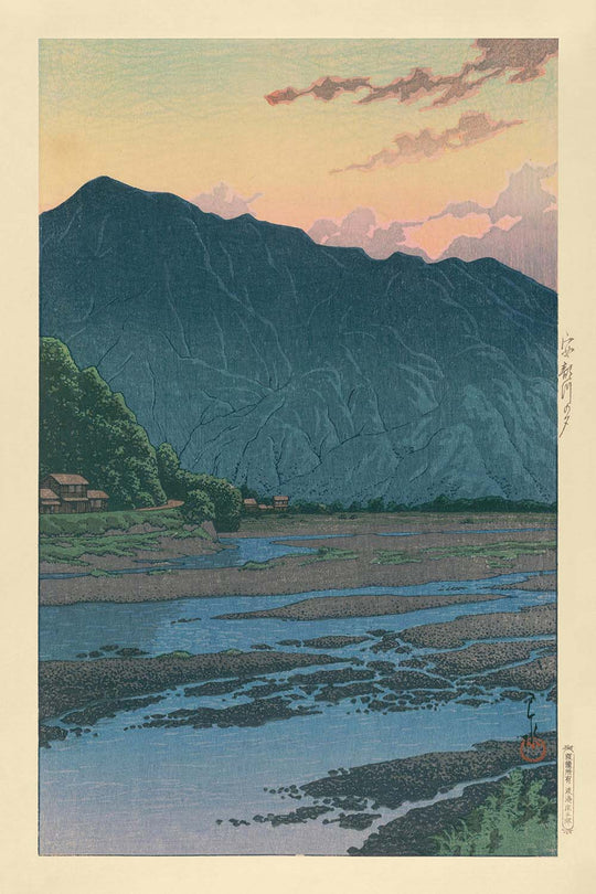 Mountain Sunset and Muddy River by Hasui Kawase is a striking woodblock print created in 1935. This exquisite piece of art stands as a testament to Kawase's mastery of the Shin-Hanga movement, which fused traditional Japanese woodblock printing techniques with Western styles. Kawase is celebrated for his tranquil depictions of Japan's natural landscapes, capturing the ethereal interplay of light and shadow that characterizes his work.
