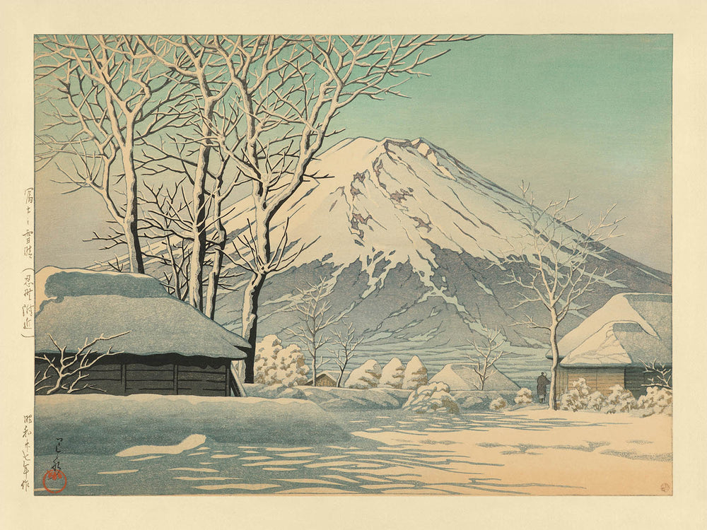 Mt. Fuji after Snow in Oshiono is a captivating woodblock print by the esteemed Japanese artist, Hasui Kawase, originally created in 1935. Kawase is celebrated for his serene landscapes and his mastery in the shin-hanga movement, which sought to revive traditional Japanese woodblock prints by integrating Western styles and techniques. His works typically capture breathtaking views of Japan's ethereal landscapes, offering a glimpse into the country's natural beauty.