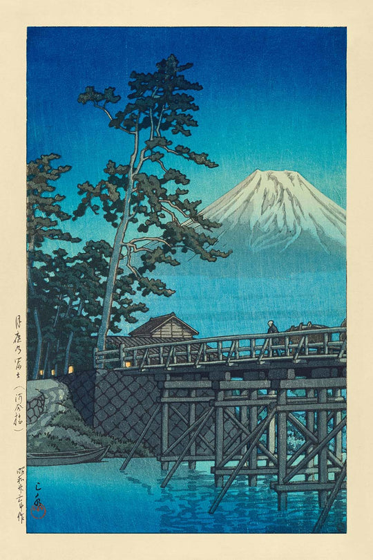 Mt. Fuji in Moonlight, Kawai Bridge is notable for its elegant composition and dream-like use of colour. Delicate shades of midnight blue dominate the sky and river, enhanced by cool, luminescent whites and subtle browns in the bridge and shoreline. The moon’s reflection shimmers upon the water, while faint cloud wisps and soft village lights create a meditation on peace and stillness. This print exemplifies Hasui Kawase’s ability to blend realism and mood, making each piece not just a scenic depiction, but an invitation to tranquility.