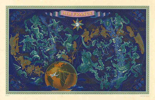Originally published in 1959 by Lucien Boucher for Air France, this is probably the most beautiful and decorative world map ever. Most of this map is a double hemispheric view of of the night sky with dozens of constellations illustrated in wonderful detail. All of the 12 major zodiac signs are here, plus many others.