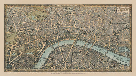 A beautiful bird's eye view of central London as it was over 130 years ago, covering London's busiest regions such as Covent Garden, Westminster and the City of London.