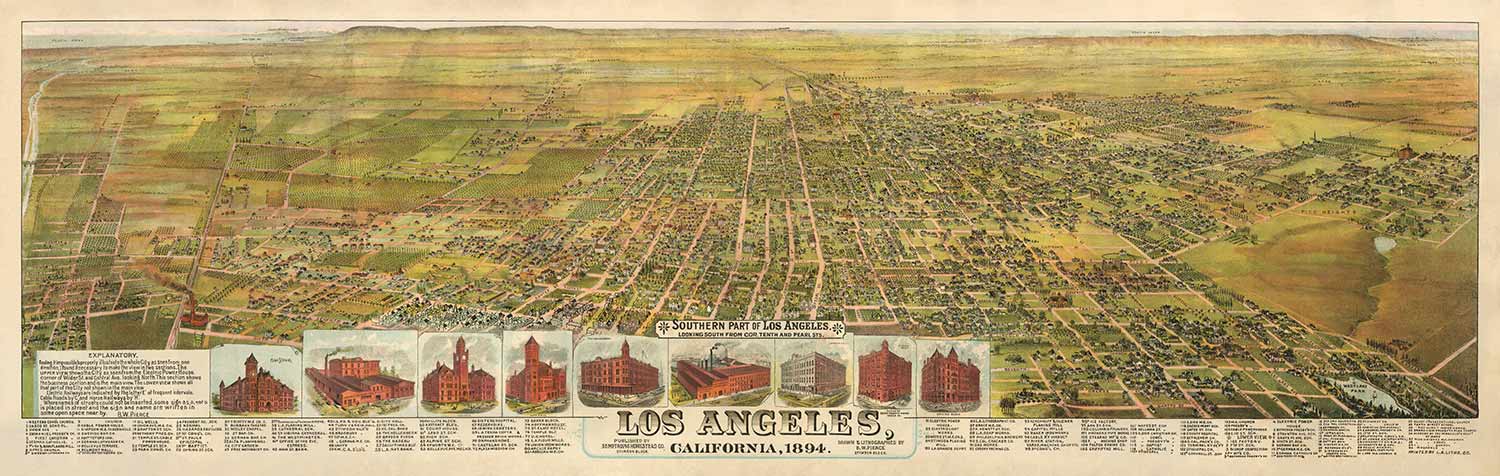Old Birds Eye Map of Los Angeles in 1894 by BW Pierce: Downtown, Historic Southern LA, Pico, Inglewood, Pacific Ocean